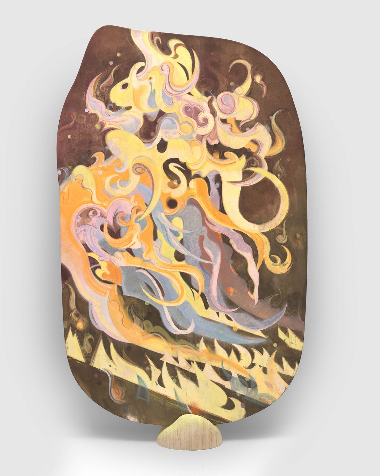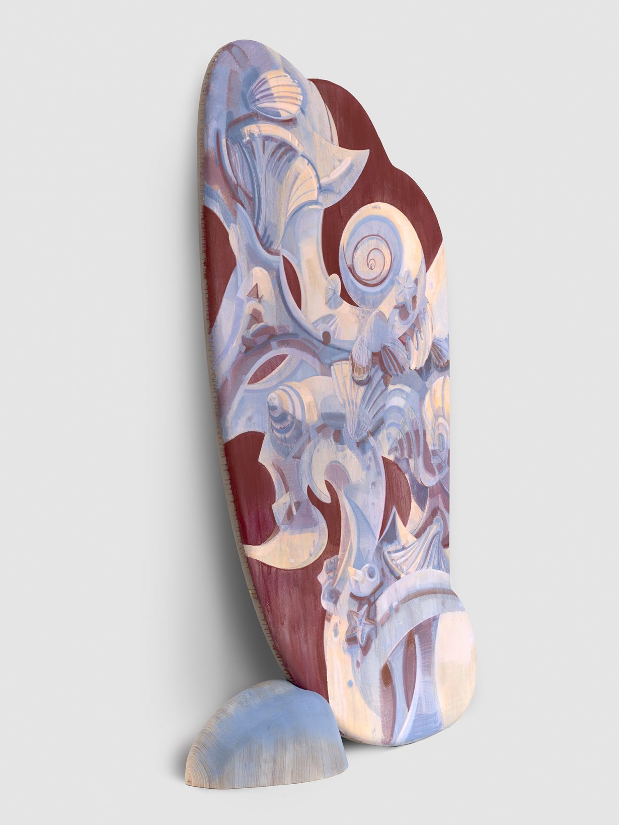 Su Yu-Xin, Palindrome (Silver and Copper), 2026, white silver, copper oxide, realgar, biotite, ceramic glaze powder, azurite, basalt, and other handmade pigments on a shaped wooden board, 54 × 22 × 6 cm. Courtesy the artist, Yubo Dong and Albion Jeune
