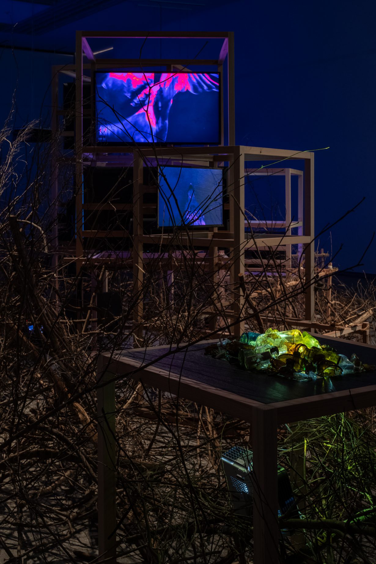 All of the above are evidently in play in Robert Zhao Renhui’s video installation Seeing Forest (2025; an adapted version of the artist’s video installation in the Singapore Pavilion at the 2024 Venice Biennale), which looks at areas of deforested or developed land in his homeland that have since been reclaimed by nature: the secondary forest. The installation appears as a rubble of disintegrating wooden shelving and dried branches, bottle fragments and other detritus: as if it were a museum display highlighting entropy rather than order. The three-channel video The Owl, The Travellers, and The Cement Drain (2024) offers CCTV-style footage of wild animals making themselves at home in anthropocentric infrastructure (bins, drains, culverts) in such a way that the landscape-cum-trashscape becomes an entangled palimpsest of human and nonhuman occupation: favouring neither the one nor the other. A wall text tells us that some of the bottles and debris displayed in the installation were left by Japanese soldiers during their occupation of Malaya during the Second World War and discovered by the artist while rummaging through the forests, which serves to link violence done to nature with violence done to humans, and people to place.