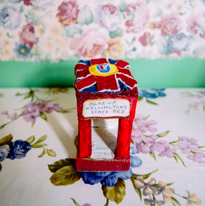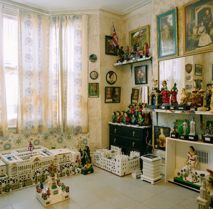 The interior offers further evidence of a life lived through the practice of art. Every room of the flat, from bathroom to backroom, is filled with dozens of models of historic buildings made out of plaster, boxes and gimcrack souvenirs. A miniature Buckingham Palace dominates the bedroom, sitting next to St Paul’s Cathedral, Syon House and other royal residences. Galitzine lifts the roofs of these dollhouses to reveal scale furniture constructed from recycled materials: a four-poster bed decorated with a Foster’s lager logo and coloured silk; miniature rooms wallpapered with pictures cut from books. The walls of the flat itself are busy with Dalton’s near-psychedelic paintings, created by recolouring cheap reproductions of neoclassical portraits (as well as photographs of the artist) in flat planes of bright, overlaid colour. Shelves and cabinets are overcrowded with figurines repurposed as busts of the kings, queens, generals and movie stars Dalton admired, from English kings to Charlie Chaplin.