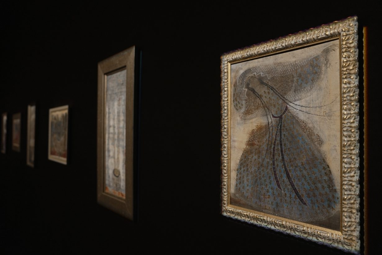 Another section of the exhibition foregrounds Abramishvili’s figurative works, including ethereal friezes of dancing women. The floating bodies – outlined with expressive contours and dressed in patterned garments – suggest a choreography of perpetual becoming. Their movement, ‘resembling flight’, speaks to an understanding of the body not as earthly weight but as a conduit for the effervescence of life.