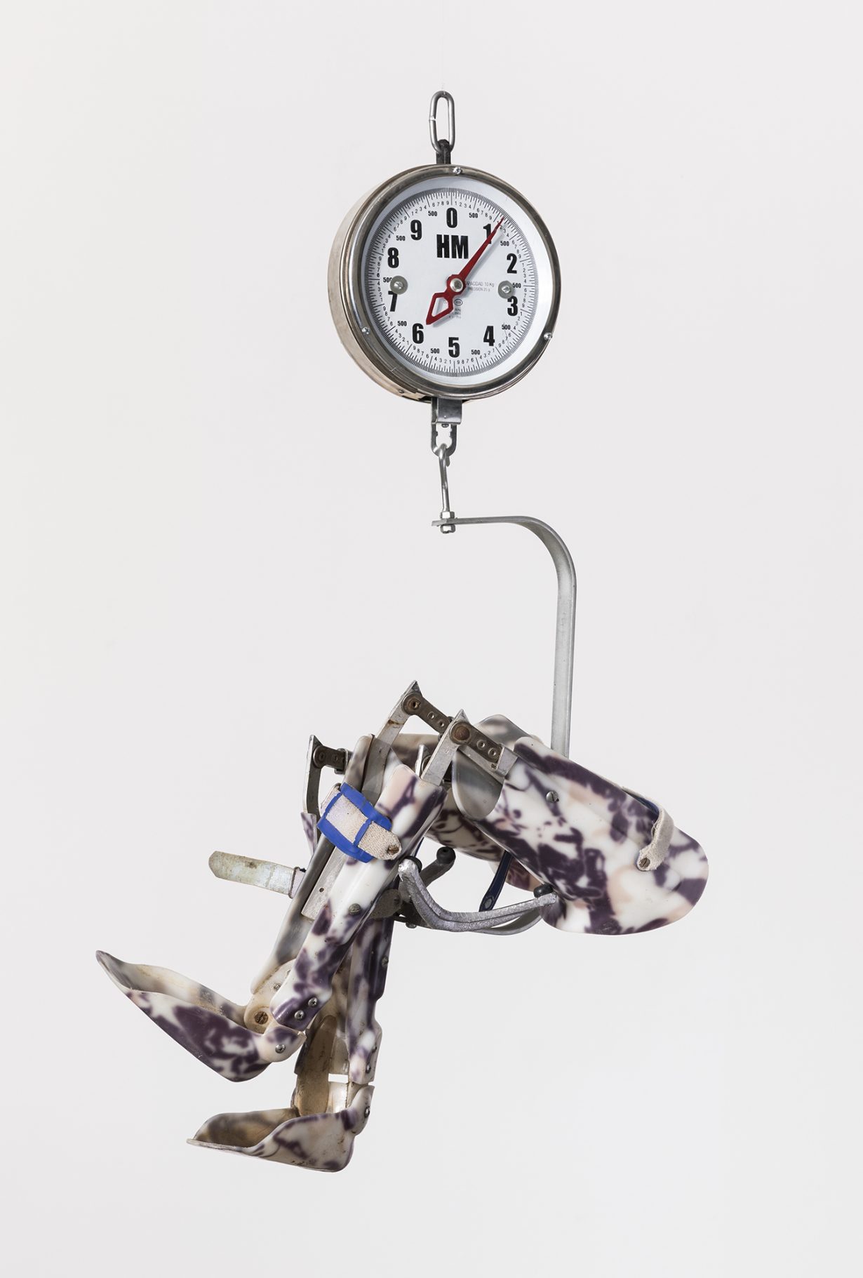 Mathilde, 2018, hard-plastic orthopaedic braces, medical weight scale, steel rods, cloth straps and aluminium hooks, 100 × 57 × 31 cm. Courtesy the artist