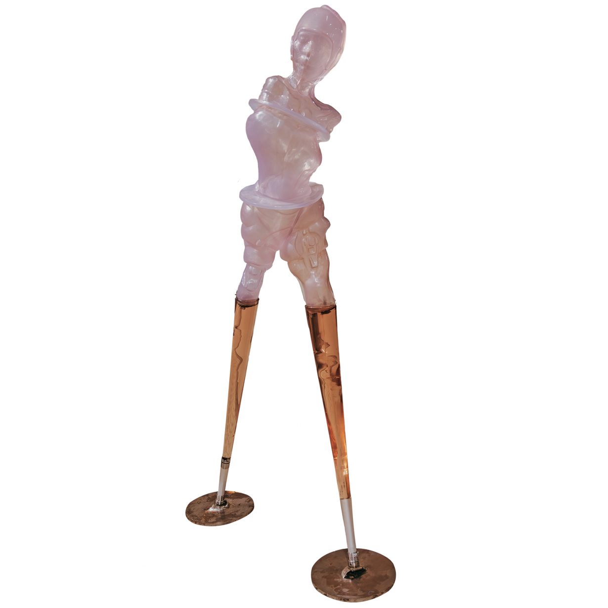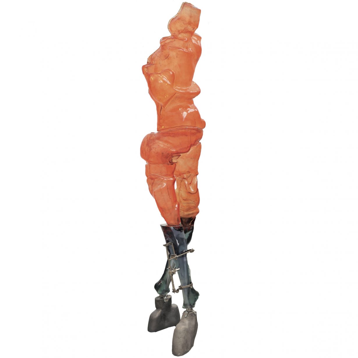 (above) Rutilio, 2024, ThermoLyn orthoprosthetic, intramedullary femur nails, cortical screws, surgical steel traumatology instruments, aluminium tube and socket adapters for prosthesis, resin and lead, 247 × 59 × 46 cm. Photo: Chris Gunder. Courtesy the artist