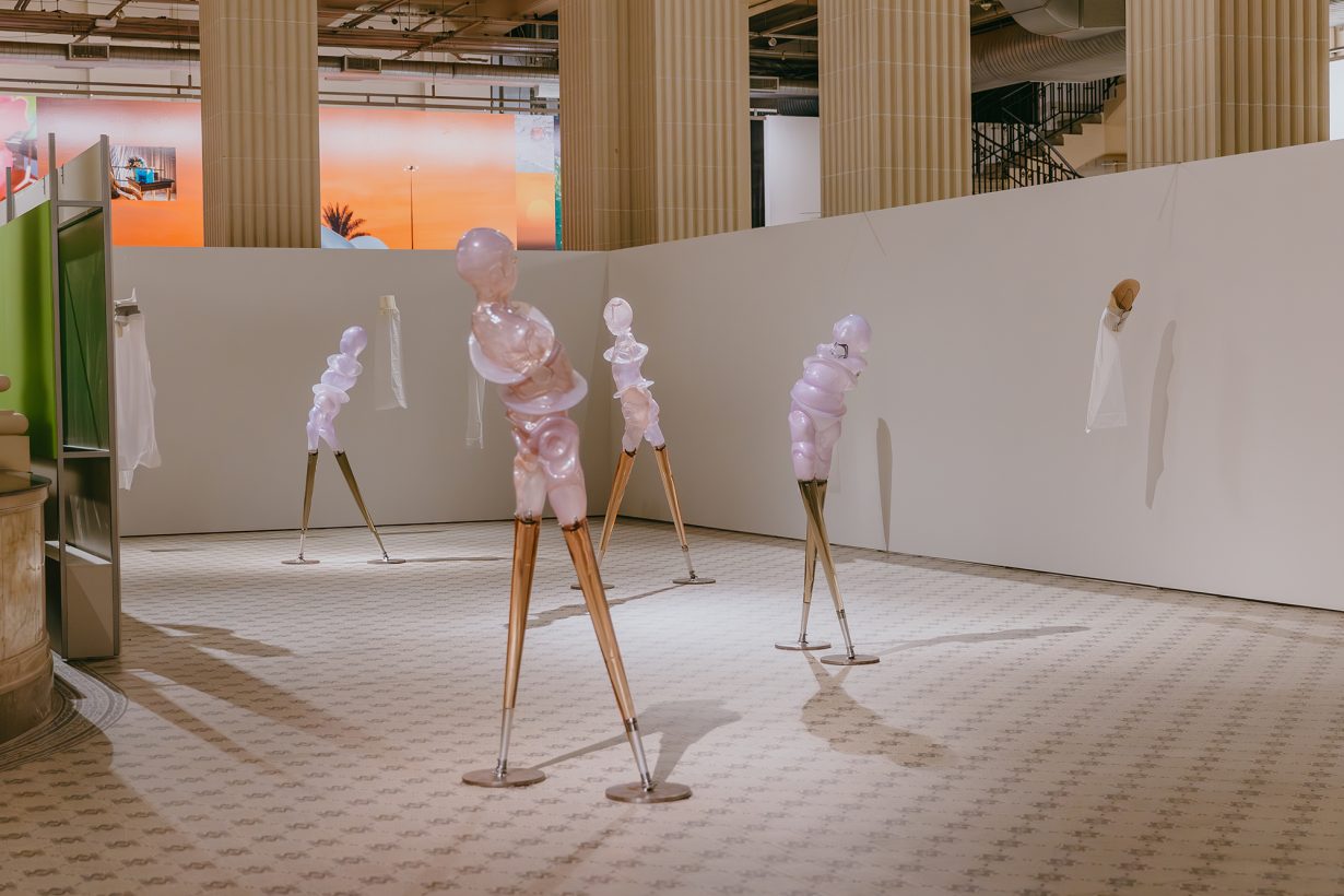 Iron lungs were invented during the early twentieth century to assist polio patients whose paralysis had affected their chest muscles and who required assistance in order to breathe; Pnoê is based on a 1960s model. “Our bodies are fragile, we saw that during the [COVID 19] pandemic, but that fragility is not extraordinary: our bodies are disabled in all kinds of environments. They work, but only if the correct ambient conditions are in place,” she says. I tell her that the sculpture reminds me of the clunky, copper-hat diver’s suits, a reminder that it is environmental factors as much as body difference that render the body disabled. “The human being is a prosthetic being,” she says. “We can intervene, we can modify our nature, in order to open horizons, possibilities of who we are and what we are able to do.” Attached to the bottom of the lung is a series of LED-lit tubes that snake across the gallery floor and then up to three semitransparent silicone sculptures, suggestive of human organs or air bubbles that hang suspended from the gallery ceiling. Like the Mercosul figures, there’s an alien aesthetic to these elements, an indication that the artist is as interested in speculative transhuman futures as she is in questions of disability past and present.