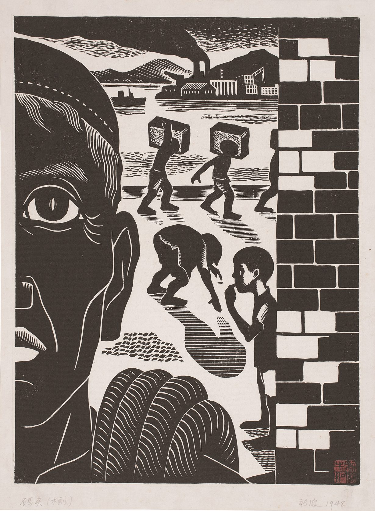 Woodblock printing became a crucial medium for artists wishing to play a role in the ongoing civil and political strife, and influence events. A photograph of Lu Xun, the revered modernist writer and founder of the New Woodcut Movement, sitting with young woodcut artists (many of them Guangzhou-based) at the Second National Traveling Woodcut Exhibition, in Shanghai in 1936, is displayed next to striking woodcut prints with themes of poverty, hunger, war and the toil of manual labour. In the section ‘Image and Reality’, Gu Yuan’s Exploding Bunkers (1948), a coloured woodcut print in black, red and white, shows soldiers sabotaging enemy positions at night, while his Seed-sowing (1939) presents the muscular back of a farmer wearing only rolled-up trousers, the darkness of his body echoing the hardship of days spent on the field. War was no longer depicted through oblique symbolism or stylised warriors: images became more immediate, and painful. Gao Jianfu’s ink painting Flying in the Rain (1932), from a distance, could seem an idyllic southern Chinese landscape, with mountains fading in the misty distance, a pagoda emerging from pine trees and a meandering river in the foreground. On closer look, though, a formation of warplanes in the sky testifies to the Japanese military invasion and the harshness of contemporary reality. Chao Shao-an’s ink Skull in a Faded Dream (1955) portrays an abandoned skull and bones, among forlorn blossoms in a grey landscape.