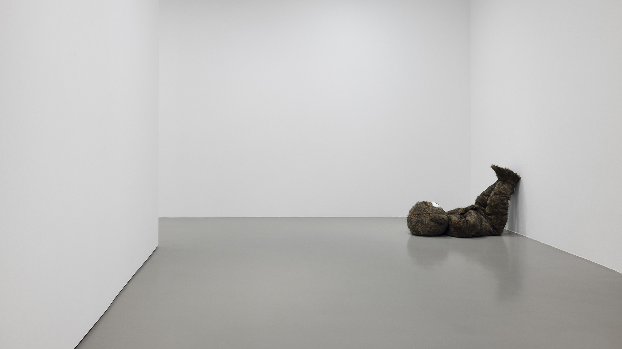 When, in Trick, the occasional human body appears alongside these ominous details, it evokes a narrative at once indelicate and introspective: as part of a third untitled assemblage that occupies the length of a wall in the gallery, a papier-mâché mannequin with an unformed face and a crudely textured, splotchy pink body lies supine over a wooden pallet. Across its chest, the dummy – vaguely female, adolescent – wears a bandeau, which the exhibition materials describe as a ‘training bra’ made from the T-shirts of the artist’s past partners. A cylindrical stump protruding from the figure’s left heel suggests dishevelment following a Cinderella-style flight; a hole in its hollow head alludes to injury as well as surgery. The same childlike character appears in Heads, another quasi-domestic assemblage composed of a midcentury display case stacked on a plywood box and a concrete plinth. Ouyang’s pink and pitted proxy hangs from the side of the wooden box with its knees tucked and its head inverted. Seven scythes protrude from oblong holes in the plywood, narrowly sparing the figure’s bare feet and white miniskirt. What is depicted in Heads, the exhibition suggests, is another brush with death in the plot of a hellish bildungsroman.