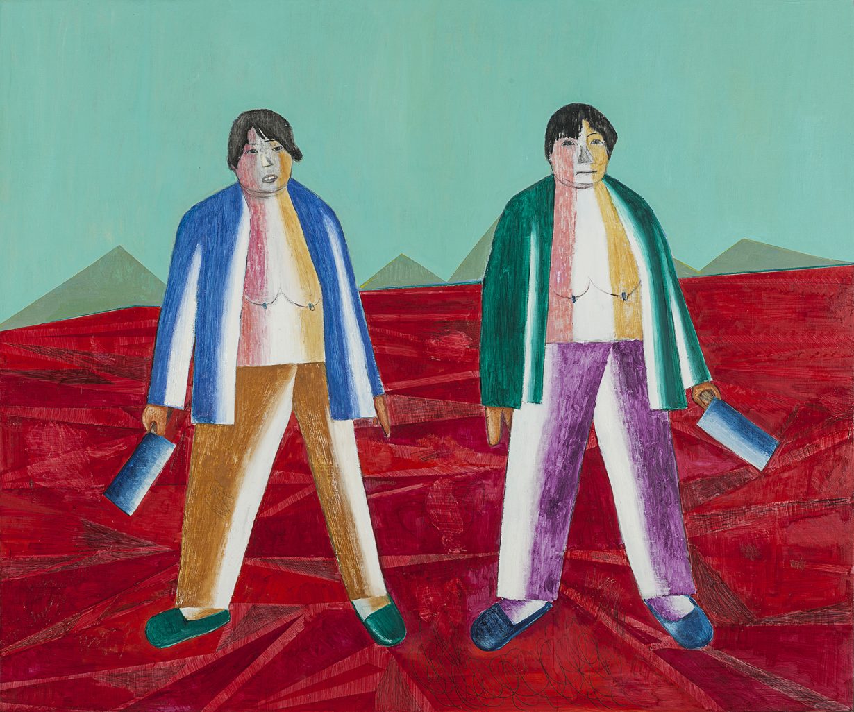 in the geometric style of Kazimir Malevich’s Sportsmen (1931) – such quotations from art and cultural history remain a mainstay of the artist’s output – they stand staunchly against a blood-coloured landscape. The painting was made in response to the news of farmers’ land being stolen and expropriated for real-estate development during the early 2010s, as an imaginary vision in which the farmers make their presence known and feared. While rural scenes were often romanticised in the Socialist Realist tradition championed by Chinese art academies, Duan’s versions by contrast privilege physical reality over idealism. Here lies her astutely sympathetic observation: the two pairs of drooping breasts, for example, capture a rustic gesture of protest – a determination to suspend good manners and fight at any cost.