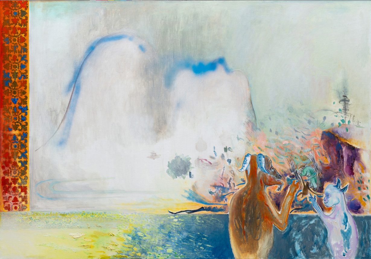 The 20 canvases are roughly divided into four groups, starting with the imaginary going-abouts of the woodcutter and fisherman; the second grouping takes place on farmland, where animals confront their human owners and appear to question their fate; the third is a sidetrack into the imaginary day-to-day business of Duan’s childhood cartoon hero the Black Cat Detective (1984); the conclusion draws the previous scenes into contemporary urban life. References to classical, literary sources abound, but are evoked in a way that’s more iconoclastic than reverent; indeed, the closest you get to traditional paintings of saintly seclusion is in Yúqiáo… No.1, a work depicting gallery-going goats. In this work, a pair of goats gesticulate in front of what looks like a shanshui painting after Northern Song dynasty painter Fan Kuan’s famous Travelers Among Mountains and Streams (c. 1000). The goats are looking at a detail in the painting: a woodcutter who walks along a mountain path, carrying logs, with a monkey jumping along his side. Rather than one of admiration, their pointing fingers suggest a judging, gossiping gaze.