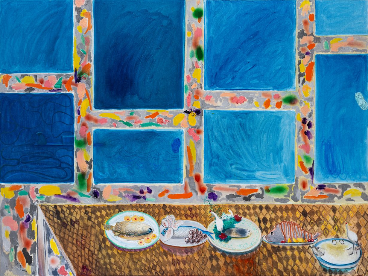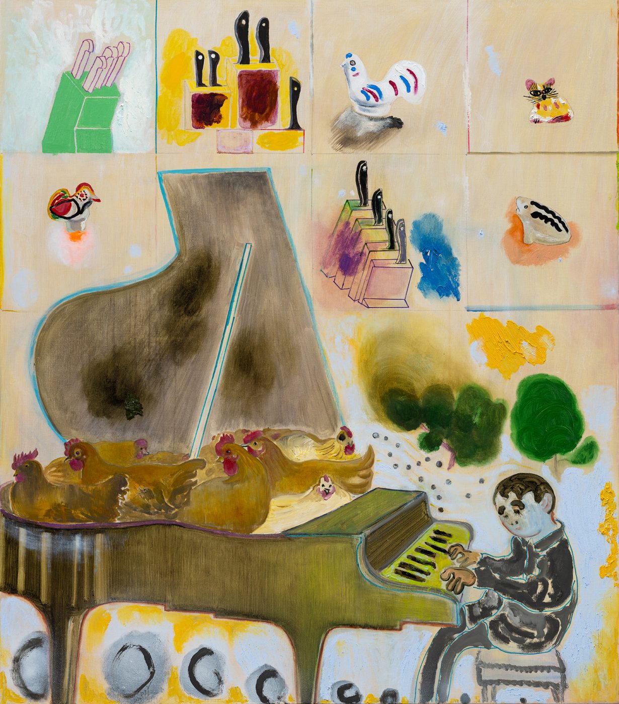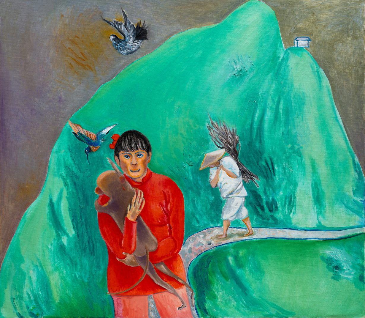 Duan continues to pay attention to everyday life in both its banal and fantastical realities via paintings that often capture wacky, surreal scenes reflecting disjunctive states of urban or rural life as a consequence of rapid change. Stylistically they flirt with the ugly and vulgar, infused with a deadpan and, at times, brutish humour. Characteristic of this is her exploitation of recurring motifs such as chickens: a clucking, flustered animal often roaming free in village yards, as well as a culinary delight (“the whole city of Guangzhou is very good at cooking chicken”, she boasts). For Duan, the animal represents a down-to-earth liveliness and a vehicle through which to poke fun at high-culture. In Sister No. 1 (2004), for example, three busty, tackily dressed ladies pose like supermodels while holding rather more earthy staples of rural produce: a watermelon, a bucket of fish and a hen. The women are dressed as flight attendants, which, at the time, represented a newly respectable career and a reflection of China’s participation in the global economy. Their offerings, however, spoil the profession’s courteous, cosmopolitan charm. In Yúqiáo (The Fisherman and The Woodcutter) No.17 (2024), a handful of chickens cluster inside a grand piano, with a smear of dark green impastoed on the piano’s open lid, the texture of which might pass as actual chicken shit. A young boy plays the instrument, evoking the idea of a wild mix of cacophonous sounds. “I think humour contains a kind of wisdom – an especially direct form of wisdom.”