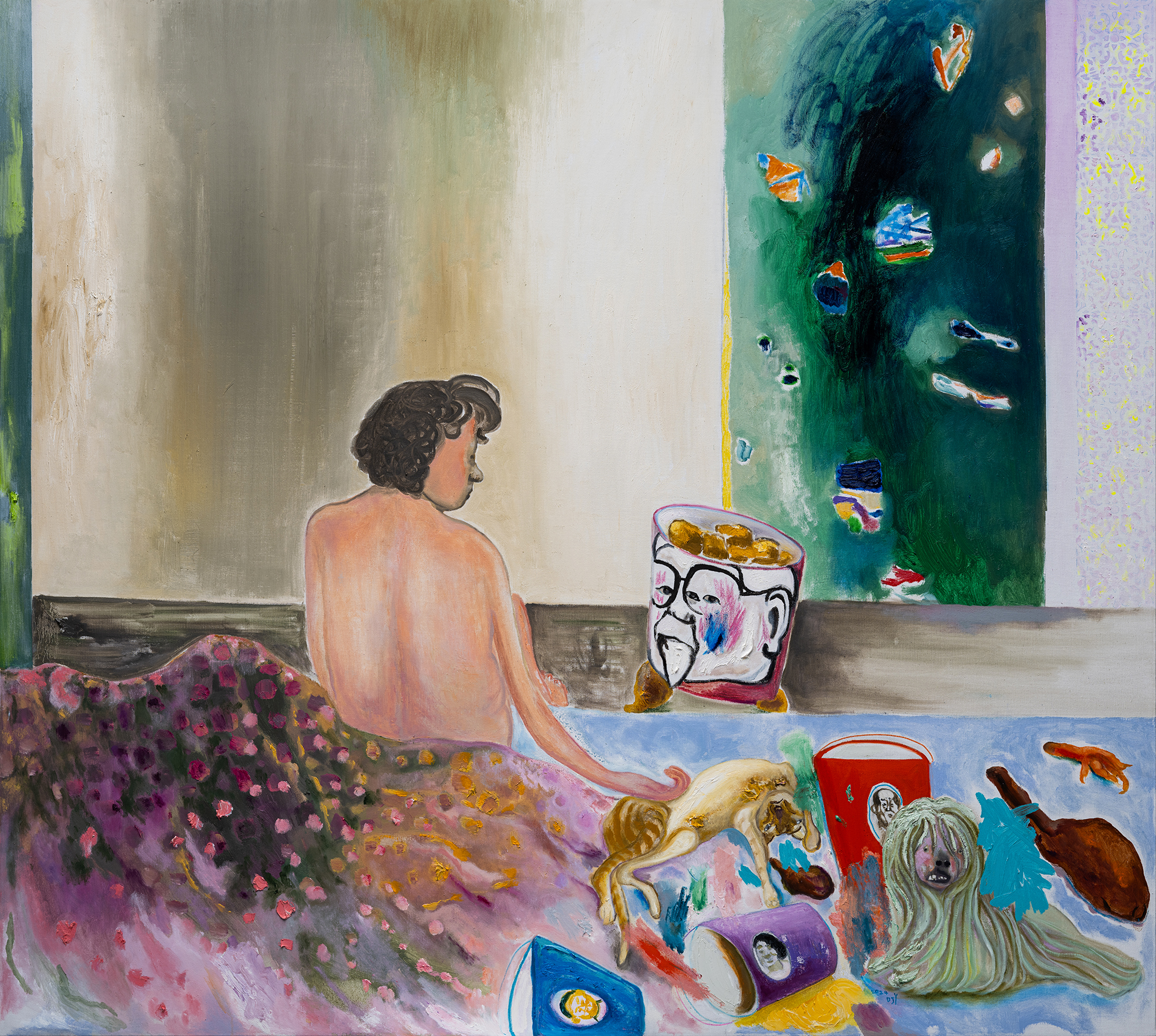 Yúqiáo becomes a space in which to engage with contemporary conditions of disengagement and to discuss human agency or the lack of it. In Yúqiáo…No.20, the literati recluse has become a slovenly, stay-at-home figure. At the centre is a solitary lady (a self-portrait) sitting on a bed littered with dirty linen and food packaging. A cat is her sole companion. The scene triggers a range of associations: urban life’s fast-paced, makeshift lifestyle, the sentiment of JOMO – the joy, as opposed to fear, ‘of missing out’ – and flashbacks to the claustrophobic pandemic lockdown. For the artist, too, this reflects the increasing disjuncture between realities of the physical and the digital sphere. “Nowadays, people may not go out for a month or two, constantly ordering takeout, and then all the garbage will pile up in the house,” Duan explains. “They may be influencers or livestream on social media. They may be well-known figures, but their homes may still be a mess.” It’s a rather sarcastic image of retreat motivated not by a desire for spiritual achievement, but something else. In China’s classical literati oeuvre, another saying goes, ‘If you are successful, you should help the world; if you are not recognised, you should take care of yourself’. Duan’s work suggests that this advice might still come in handy today.
