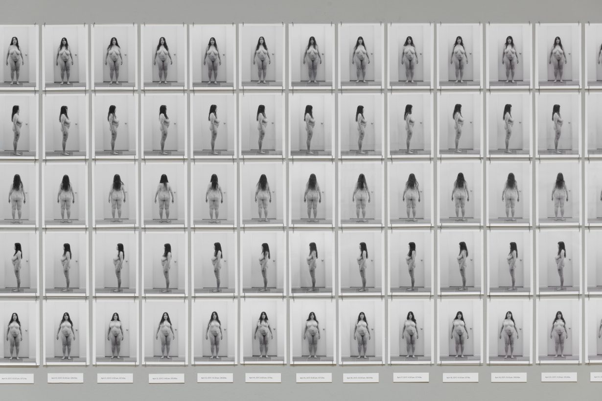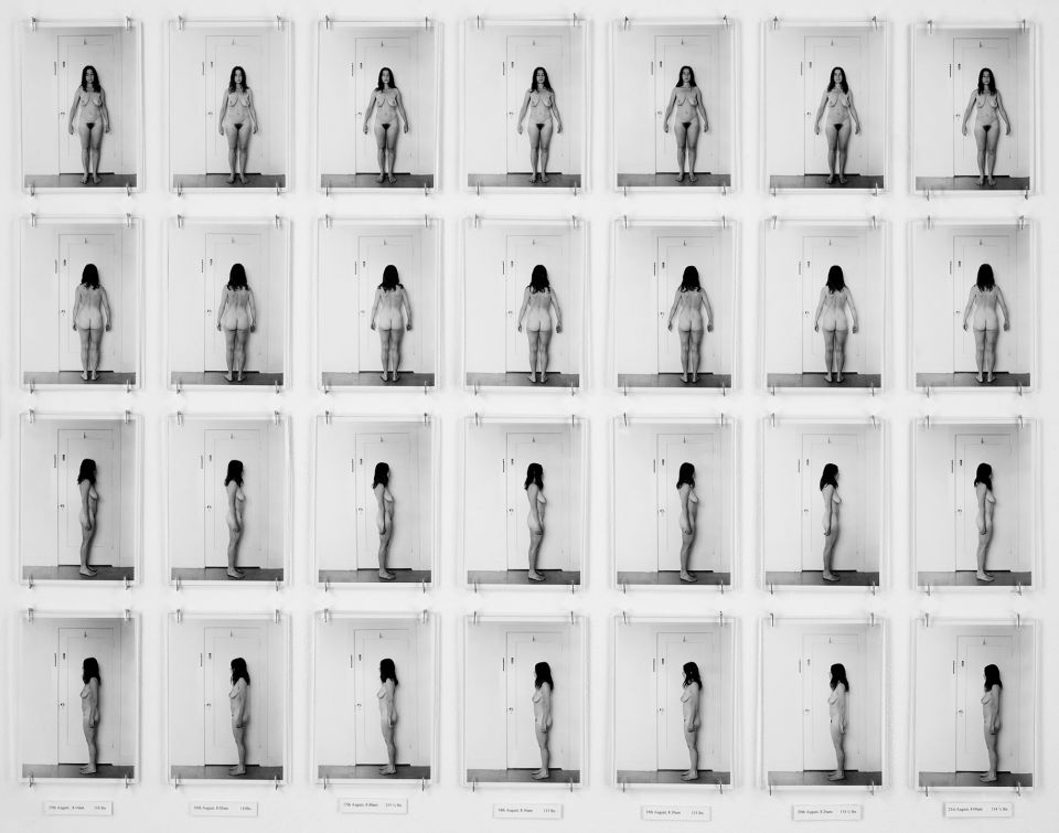 From one angle, Antin’s position can look like a cop-out. Her work imagines political interventions, but a dose of cynicism protects it from the failure of critique. It resists, knowing the system will absorb resistance. But this mix of stuckness and hope is a particularly feminist feeling. Antin’s key feminist works are here, including Carving: A Traditional Sculpture (1972), in which she documented her attempt to lose ten pounds: across 148 monochrome photographs her naked form is gradually chiselled away like a classical nude, transformation also a sorry capitulation to a white patriarchal ideal. In her most recent work, Carving: 45 Years Later (2017), Antin repeated the diet and again documented her weight loss in a series of frank photographs. Grieving after the death of her husband, poet and artist David Antin, her self-scrutiny as an older woman is now full of subversive promise.