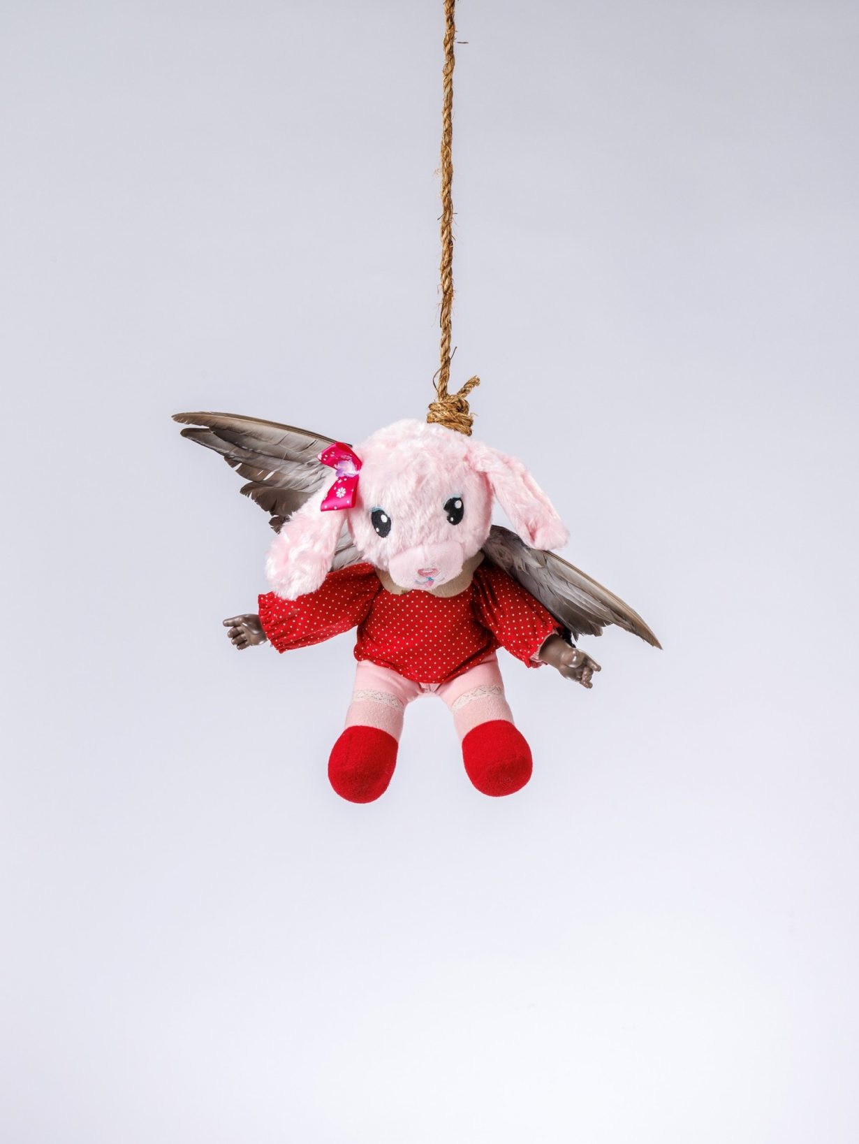 Precious Okoyomon, You have got to sometimes become the medicine you want to take, 2025, artist-made children’s toys with taxidermied bird wings, rope, and motor, dimensions variable. Photo: Markus Tretter. © and courtesy the artist. Courtesy Kunsthaus Bregenz