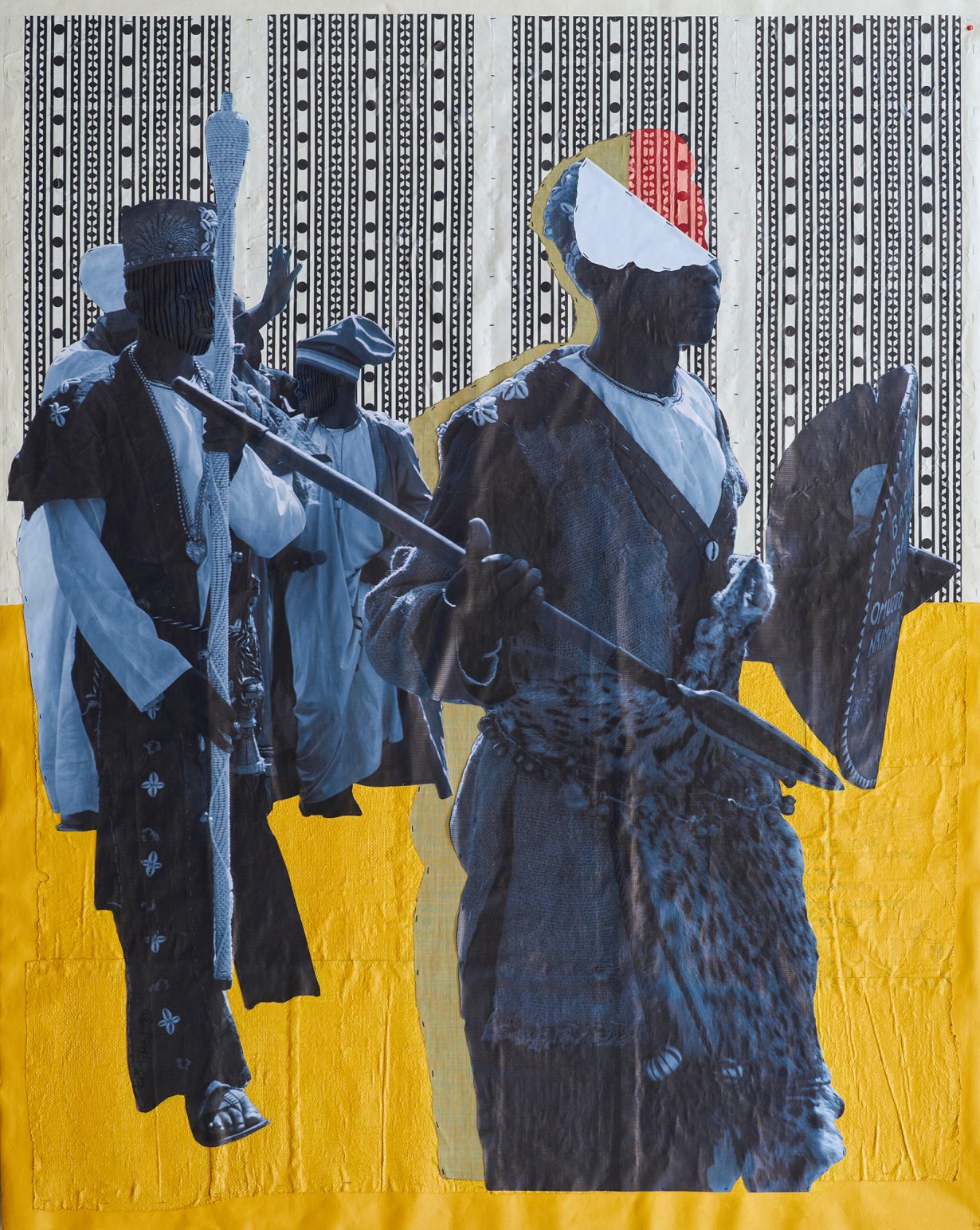 Currently based in Uganda, while born to parents from Uganda and Rwanda, Collin Sekajugo’s collaged paintings, principally employing materials such as polypropylene bags, denim fabric, bark cloth, acrylic paint and waste paper, attempt to speak on issues ranging from the social, cultural, political and economic realities from a local perspective with awareness of their global entanglements.