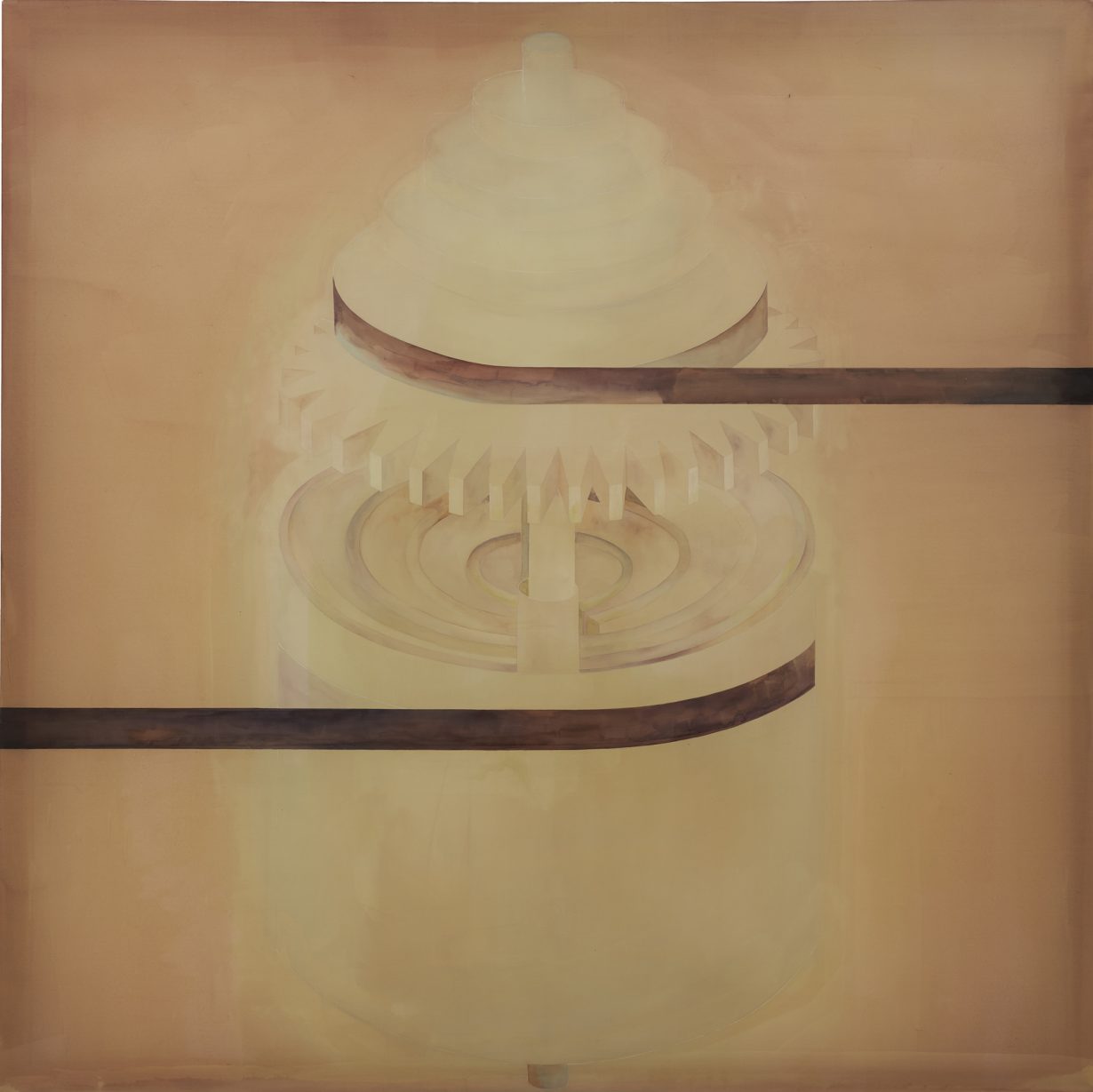 In an era when much contemporary painting is mired in conservative aesthetics and seemingly wants to look away from the present, Leah Ke Yi Zheng addresses herself directly to our digitally addled moment, inventively rewiring the oldest artform to consider the consequences of the newest tech. Admittedly, a viewer might initially think that the Wuyishan, China-born, Chicago-based Zheng is backtracking somewhat into modernity: a painting such as Untitled (2025) is one of a number of paintings (we won’t say canvases, since she paints on translucent silk) that, since circa 2021, have featured pale, ghostly representations of a fusee, a conical spindle integral to antique watches. Yet Zheng isn’t channelling Francis Picabia and Marcel Duchamp. Machinery here serves as a representable shorthand for the increasingly intangible and upending technologies of today, and offers a long view: it points, albeit without reducing the art to sociological messaging, towards the transhistorical fact that such innovations can entirely alter the texture of reality. See, for example, the beautiful-looking mechanical calculator or ‘stepped reckoner’ in Zheng’s widescreen-format Leibniz’s Machine (2024), developed by German mathematician Gottfried Wilhelm Leibniz in 1694 – a device that would reshape multiple sciences and the world of commerce.