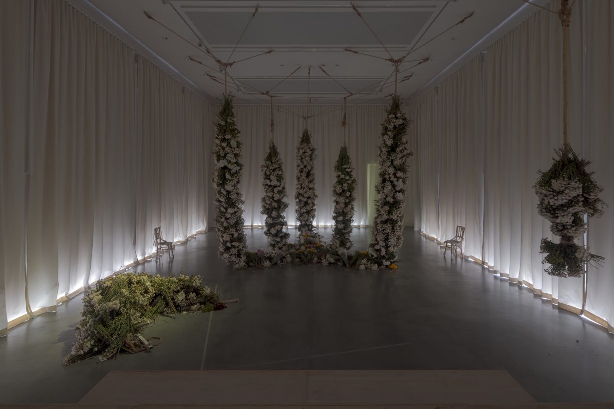 Since its 2018 inception, this monthlong video and performance art triennale series has deployed the metaphor of the ghost to explore suppressed or overlooked histories, alongside other strands reflecting on its host city, Bangkok. But suffusing each Ghost has also been a more internalised ghostliness: a current of alienation or estrangement that finds expression in each edition’s eerily askew taglines – 2022’s Live without Dead Time and this final edition’s Wish We Were Here – and performances that lean towards the dystopic or chthonic. Case in point: on opening night, the silhouettes of Senyawa, an experimental Javanese music duo who pair incantatory singing with the droning of self-made instruments, were barely visible through the billowing dry ice. Yet the symbolism of the visceral droning chants and shadowy, subterranean setting was hard to miss. ‘In a time of displacement, rupture and loss,’ writes curatorc ‘Ghost 2568: Wish We Were Here is a song for human and non-human survival within the ever shrinking spaces of freedom in our cities.’ To stand listening to Senyawa amid towers of decaying chrysanthemums sourced from Bangkok’s flower market – an installation by Dan Lie titled Patience (2025) – was to be plunged into a corporeal, yet shared, sense of escape and catharsis.