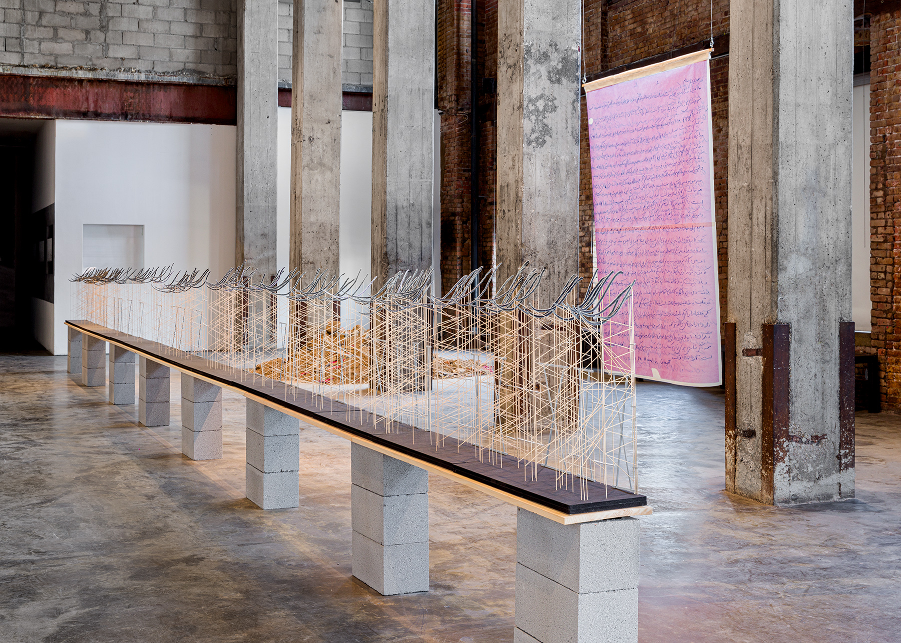 ‘If only one could measure the emotions of others,’ reads a letter sent from Golnar Adili’s mother in Iran to Adili’s father in the US. He was living there in exile as a result of the couple’s leftist activism in the years after the 1979 Iranian Revolution. An enlarged reproduction of the letter, printed on pink Japanese paper, hangs towards Smack Mellon’s entrance like a state document in a history museum. In the main gallery, a 15-metre sculpture, Ye Harvest From the Eleven-Page Letter–Installation (2016), attempts something like the accounting Adili’s mother pined for. Attached to a dowel scaffold that resembles a model roller-coaster support, the artist has reproduced in archival cardboard every Persian ye character, which has the shape of a swooping check mark, from a long letter her father sent – not to her mother but to his US lover. As if by repeating the Persian alphabet’s terminal letter she might close this unsettling chapter of her family history.