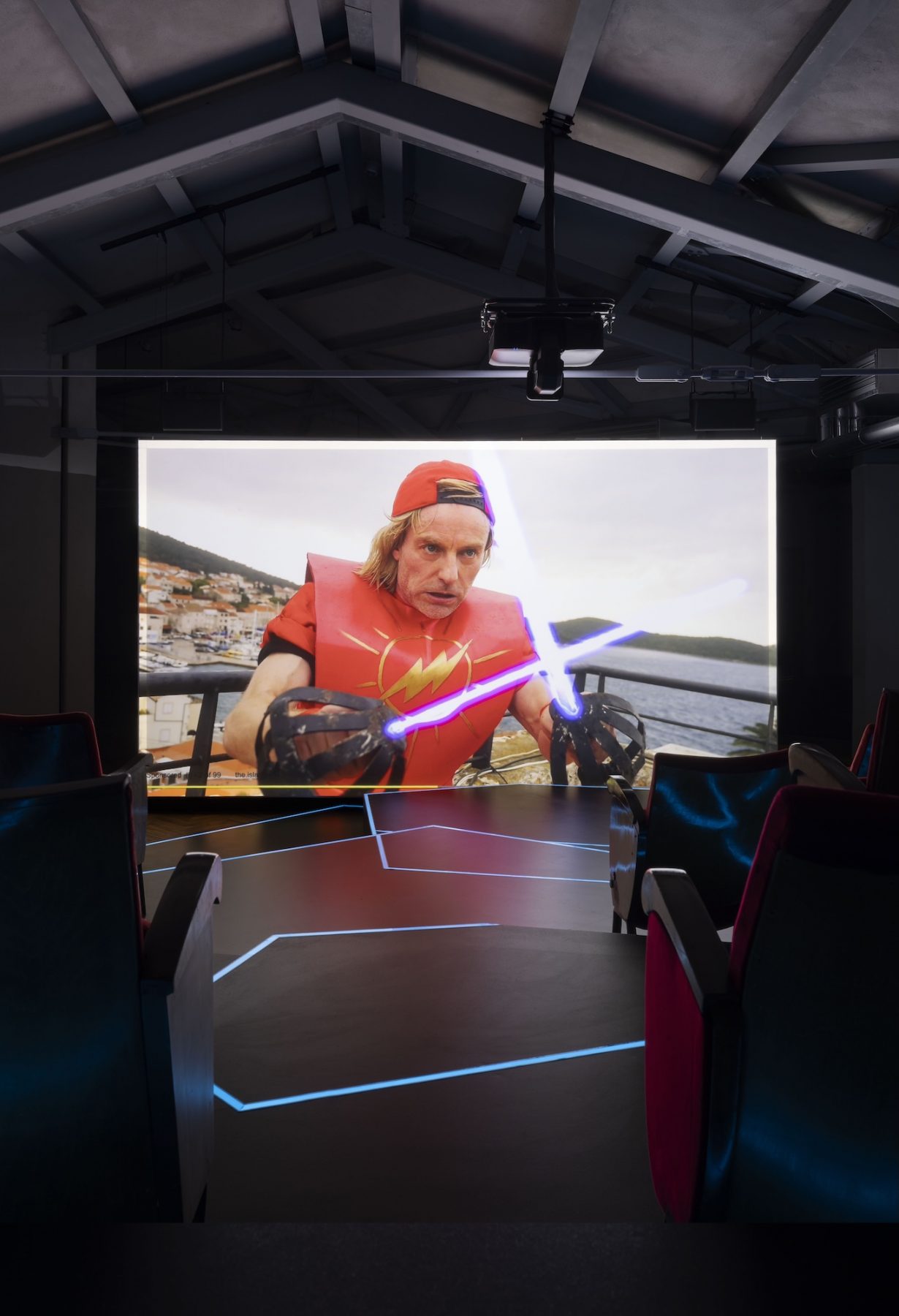 Housed in the blacked-out interior of Fondazione Prada’s penthouse gallery, with visitors guided by TRON-like blue luminescent floor-strips, are videos and video sculptures. The Island centres around an eponymous, madcap videowork, in which its comic protagonist, the avatar of Flash Gordon returned from the 1980s film (here hammed up winningly by German actor Mark Waschke) has appeared on the streets of the picturesque Croatian island town of Korčula, to ‘save the world’. The choice of Korčula links not only to the Croatian-born science-fiction historian Darko Suvin, whose recollections of his childhood during the Second World War intercut AI sequences and Flash’s adventures, but also to the story of a submerged but evidently manmade artificial island, dating to neolithic times, that was discovered offshore.