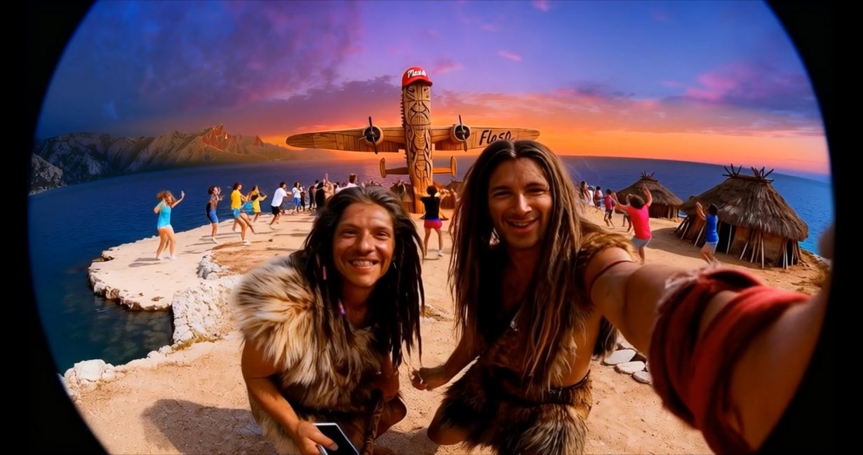 As Flash chases around Korčula, Steyerl connects the apparently unrelated themes of archaeology, quantum physics and science fiction through the voices and stories of Suvin, the quantum physicist Tommaso Calarco, punctuated by the transcendent voices of Croatian a cappella group Klapa Ivo Lozica through precarious associative leaps. These weave past and future, alternative realities and historical recurrences: an elderly Suvin muses on the ‘brown tide’ of fascism that swept Europe, which is visually reprised by the giant AI tidal wave of shit seen engulfing an AI’d Korčula; Flash battles his evil AI-spawned double; and then there’s the historical doubling of Korčula and its vanished prehistoric twin.