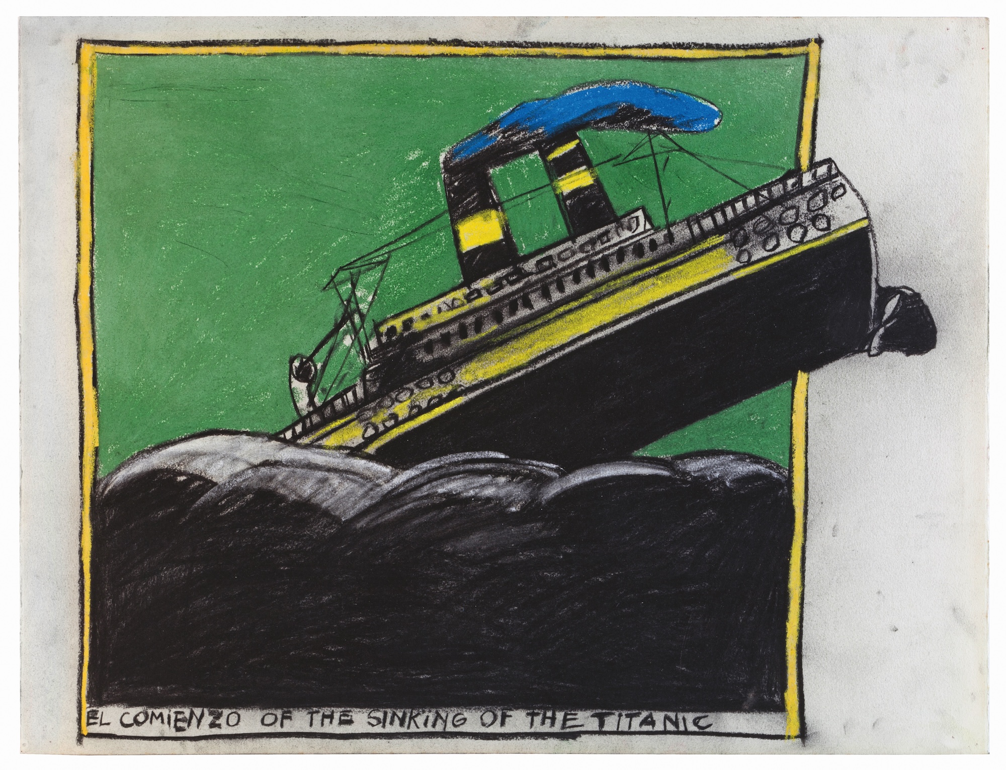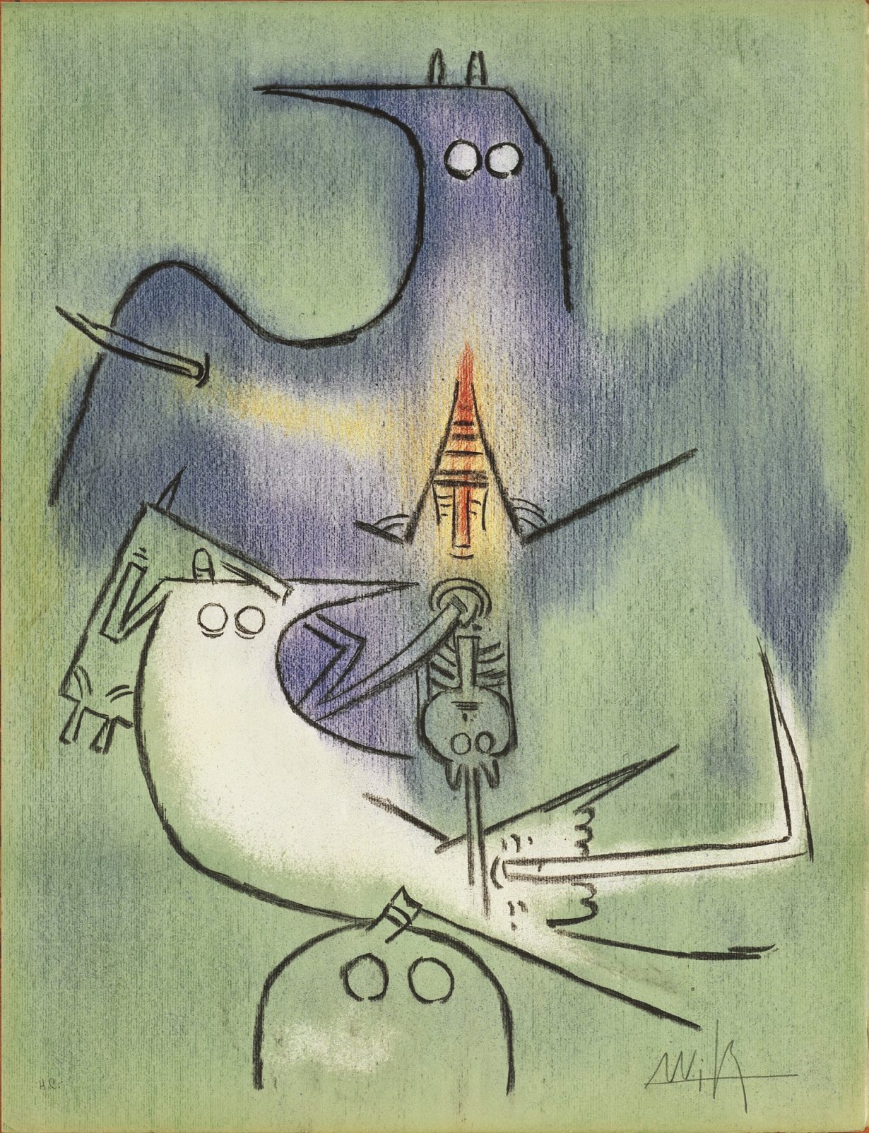 The works of art in Glissant’s orbit became imbricated in his expansive yet specific aesthetic and political views. In the same Courier article, he calls Seguí ‘Baroque’, a historical sensibility he extols in Poetics of Relation for the way it opposes the pretenses of Western rationalism. In his collection, Glissant possesses at least 12 of Seguí’s works on paper – a series of soft pastels depicting the voyage and sinking of RMS Titanic. Then there’s Lam, whose Afro-Cuban idioms or ‘creolizations’ resonated particularly well with Glissant. He owned at least four of Lam’s lithographs: three illustrations the artist made for The Restless Earth (1955), a book of poems Glissant published through Galerie du Dragon and an untitled print on vellum dated 1974. In Glissant’s eyes, Lam had earned a place in the same ‘archipels de la démesure, de la révolte et de la beauté convulsive [archipelagoes of excess, revolt and convulsive beauty]’ as the poet and theorist Aimé Césaire, and artists André Breton and Picasso. He wrote sensuously about Lam’s gouaches, such as The Jungle (1942–43), the artist’s best-known work, now housed in MoMA’s collection, lavishing attention on the hands, handlike feet, breasts and buttocks of its hybrid figures, as well as the reeds, canes, dry clays, curved masks and moons with which the figures are enmeshed.