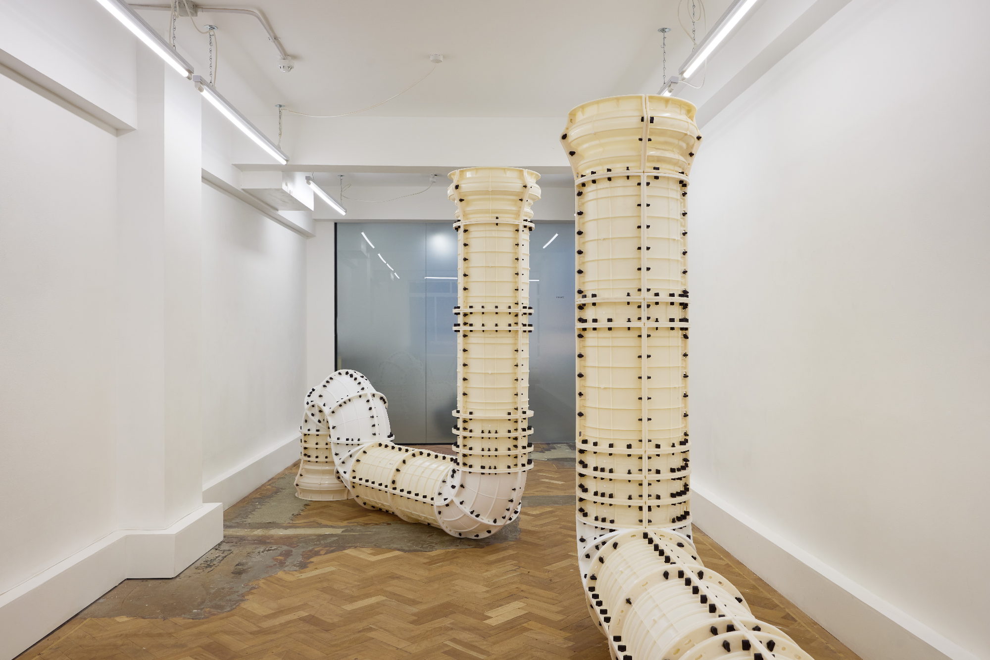 As far as readymades go, the two large tubular sculptures (IGBTTLTVOE [Elbow], 2026) that snake around the gallery are not composed of the most immediately recognisable objects. It takes a closer look, or checking the exhibition text, to get that these pale pipes, dotted with black screws, are actually mass-market plastic sectional moulds made for casting ‘antique-style’ – Doric – columns. The prefabricated modular moulds are in coffee-stained-teeth yellow. In white are Jan Vorisek’s interventions: 3D-printed versions of similar moulds but curved and plugged between the ‘originals’ to create articulations (elbows) that bend the straight objects into wormlike structures.