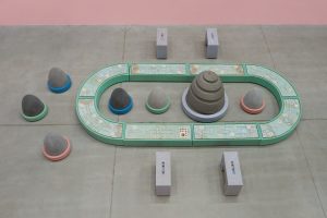 Oh’s constellation of sculptures does not overwhelm. Even in their strict concern with topology, the works feel simultaneously unremarkable and poetic. While the materials are rudimentary – as admitted in the press release – the artist somehow manages to capture an expressive poise in the works that begs one to look beyond facile sensation. Despite or even due to Oh’s reduction of sculpture to its essentials (volume and form) without much, if any, radical preamble, the objects come across as self-contained, yet assimilable to grander minimalist narratives. At times, Oh veers too close to conventional ornamentation for his own good. And that’s perhaps because works like Line Sculpture (marble with bead) #1, composed of angular dark-brown wood, wire, bead and marble, do not sufficiently respond to the (im)possibilities of minimalism as a genre. One might extend the grace of reading Oh’s standard material treatment vis-à-vis a conceptual artist’s interest in seriality, though even this affordance hangs in delicate balance against the works’ flat affect. Given this, the tensions in Oh’s pieces function kind of like an improperly resolved chord progression that makes a listener, however misguided, yearn for more.