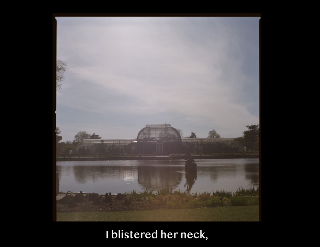 The mind’s juggling of voice, text and image and its disparate readings of the beautiful Jamaican landscape is suggestive of multiple realities intertwining (perhaps it’s more than one string I see in Miller’s score). At the end of the sequence, with about three minutes to go, the format of the photographs switches from rectangular to square, the colours faded. The Jamaican overgrowth is replaced by a more trimmed-back beauty, featuring neoclassical follies, a huge, white-ribbed greenhouse and swans – for now we are in London’s Kew Gardens, and by the time I clock this the images have jolted to another new format, in high definition and stretching the full width of the screen. The square images are like postcards, England seen from afar and long ago, whereas the widescreen envelops us, the progression reflecting the journeys of people and flora from colony to metropole. The beauty of Jamaica can be joyful and sad at once, a duality reflected at Kew, a colonial edifice where many of the plants that Gregory and her interlocutors remember so fondly can be seen. Although he is – pointedly – unnamed in the work, Gregory tells me that Rose’s abuser is based on the seventeenth-century collector of plants Hans Sloane, and that Miller’s score adapts an Angolan slave song noted down by a freed Jamaican slave and musician named Baptiste.