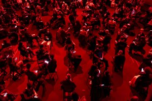 Having collected my pass I’m guided to the to the POOL area, not an expanse of water but the meeting ground and special projects space, in fact a large hall scattered with artists, gallerists and journalists who, in spite of the early hour, happily encircle the free bar at its heart. I pass up the opportunity of a 10 o’clock beer and head straight to the lecture room.