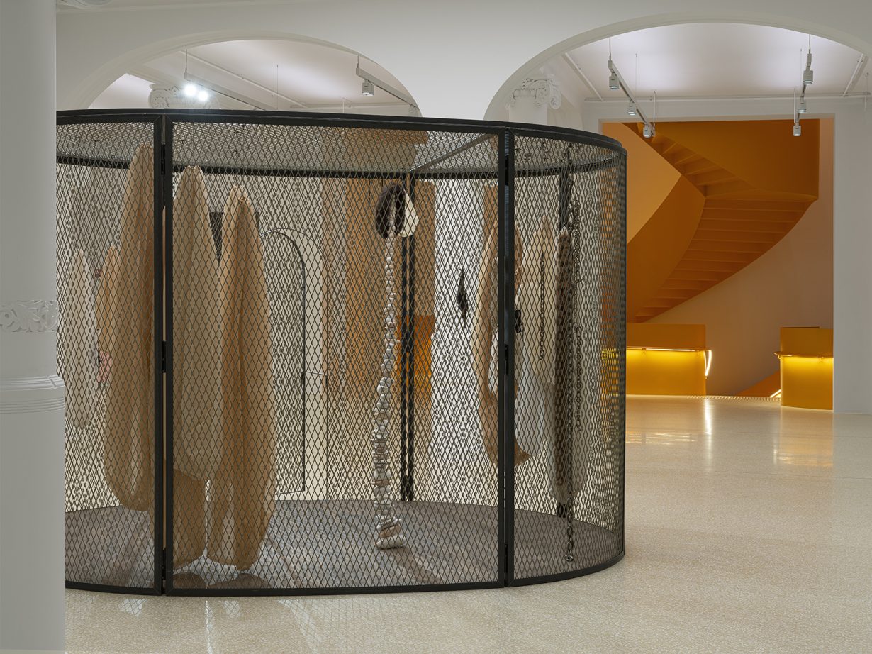 The door of an ovular steel-meshed cage stands open. Inside, flesh-coloured sacks are suspended from the ceiling like deflated breasts or soured bedsheets hung up to dry: they sag, slouched as though they gave up long ago. Alongside them are metal chains, cold and hard, and small textile figures hung upside down from string. A tower of stacked white pebbles reaches upwards from the wooden-boarded floor, curving slightly like a spinal column or an impossible cairn while an animal-fur collar sits precariously on top. Still, absent of life, but with the possibility of movement, there’s something fragile about this arrangement, like everything could collapse at any moment, though you’re not quite sure whether the function of the cage is to protect the viewer from the objects, or the objects from the viewer. This ambiguity raises a further question. If this is a physical manifestation of ageing, then what needs protection: the mind from your body, or the body from your mind? And are those stones a metaphor for tallying up your days, or counting them down? Either way, the work leaves you with the sense that time is something to be endured, not overcome, like an inescapable cycle rather than the space between the starting gun and finish line.