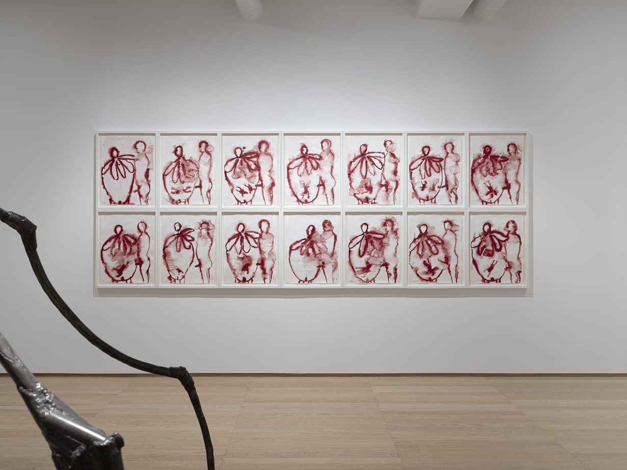The gouaches themselves are visceral and often violent things. The exhibition text explains that Bourgeois used a ‘wet on wet’ technique, ‘introducing an element of chance to the final result’, suggesting they were created at speed, in one take, with the pigment bleeding of its own accord into patterns resembling arteries or blood blots. In their shades of magenta on white paper, they present obvious associations with menstruation and childbirth, evoking the cycle from conception to birth to family that is frequently referenced throughout Bourgeois’s practice. Indeed, Bourgeois spent a significant part of her life working with the second-generation Freudian psychoanalyst Henry Lowenfeld to interrogate her own well-documented childhood trauma, and considered her art to be a way of accessing her unconscious workings. The gouache series is a key example of this method, displayed on the walls beside text from several of her reflective writings.