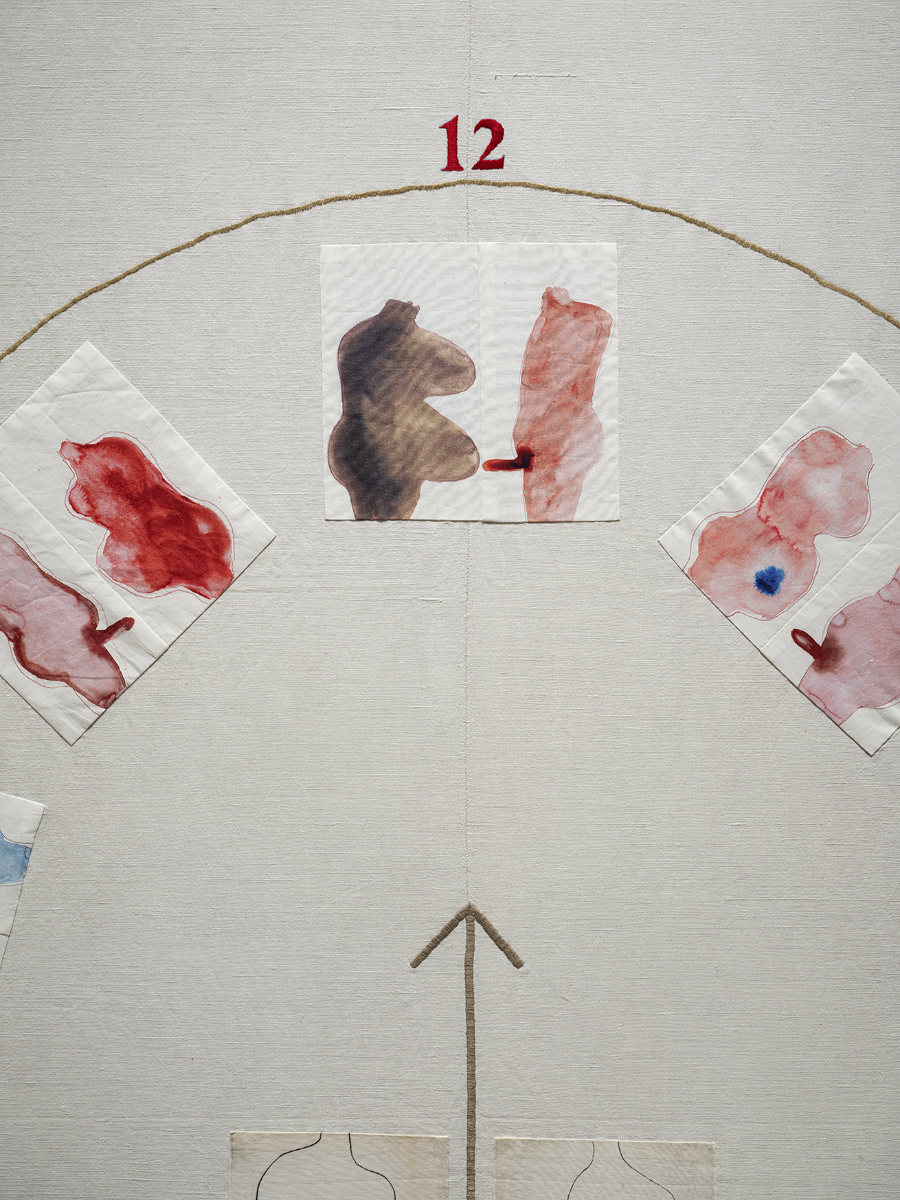 These instinctive, bodily fluid-like paintings stand in stark contrast to the careful stitching in the artist’s tapestry works, including Eternity (2009), a fabric embroidering of a 12-hour clockface with each number aligning with a painting of an aroused male body facing a pregnant female, created using digital print and drypoint techniques on a bedsheet. It is displayed opposite Self-Portrait (2009), which expands the clock digits to 24 beside diaristic drawings referencing sex, pregnancy, childbirth and, as the numbers mount, more equivocal references to dysmorphia and death. Her initials are elaborately rendered below the clock in cursive white stitching. Bourgeois’s family made a living restoring antique tapestries, and the layers of biography – from her relationship with her mother to raising her own son – are sewn into this work with a depth of nuance of which the previously viewed gouaches, many created the year prior in 2008, only scratched the surface.