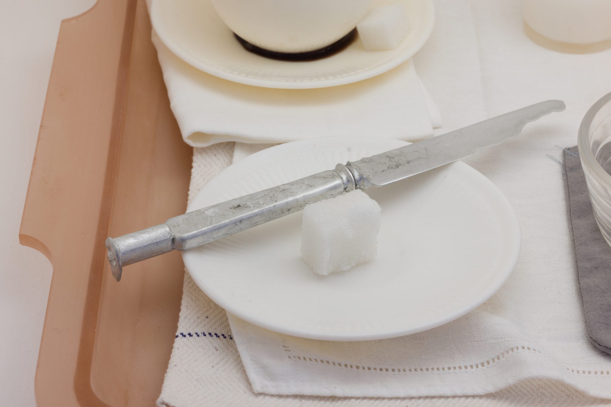 We could be doing something else than staring at these things; there’s a world of calamity and injustice out there, after all. Here, though, are thought experiments in matter, about porosity, desiccation and fluidity, that lead use back to the peculiar nature of the gallery, its physical and imaginative boundary, which makes possible the shift from the everyday to art. That this might be the case is bolstered by the two other, anomalous works here; above head-height on the wall in the main gallery is mounted a large rectangular metal cage, a utilitarian enclosure inside which hangs an audio speaker emitting a loud, harsh electronic din that floods the space, smashing any sense of quiet contemplation; an enervating white noise, almost like that of torrential rain. In the far corner, a low niche has been let into the wall. Behind an acrylic window, in this illuminated recess, sits a dinner tray, plate, cups, glasses, a knife, a jug – all of these, on close inspection, not ‘real’, but meticulously fashioned from casting resin and cast metal. It’s a coda of gentle humour to the show’s scrutiny of how artworks can distinguish themselves without recourse to glamour and spectacle – the lowly remnants of room service, things parked at the threshold of hotel rooms, but here neither in nor out, the remainder made pristine.