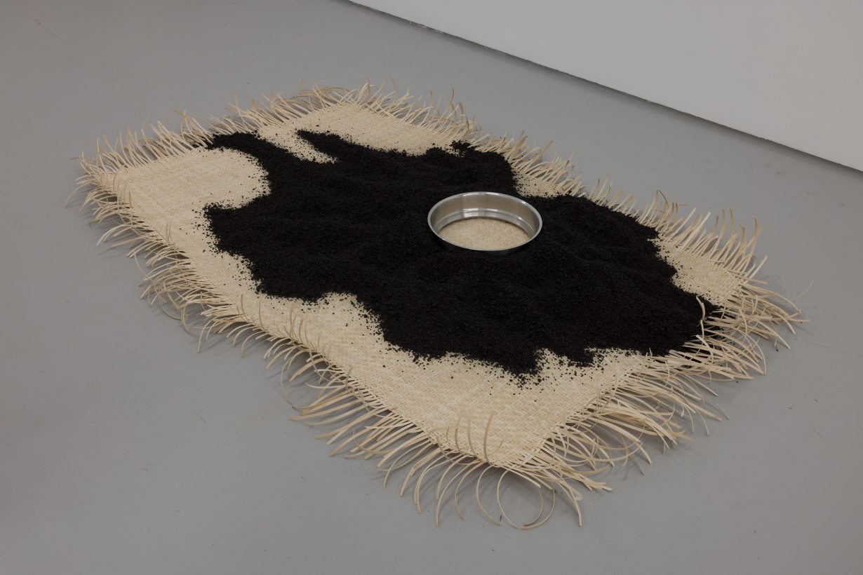 Receptacles and platforms, containment and carrying, these nouns and verbs flicker across Lai’s objects, whose forms follow their function, if only you knew what their function was. Just off the centre of a large rectangular mat of woven cane slivers sits a hollow ring of turned aluminium, like the rim of a tyre, around which (leaving the inside empty) has been poured (the checklist tells us) burnt wheat grains; a tide of saturated black that only just reaches the edges of the mat.