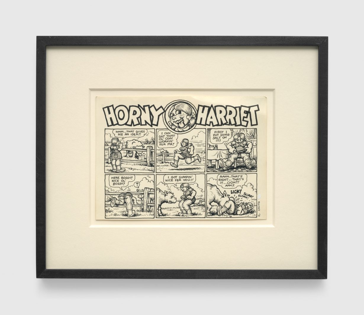 In Untitled (Horny Harriet) (undated), ‘Horny Harriet’ appears as a teen – an optimistic estimate, considering her pigtails – drawn in a thick, bulging outline, which delineates the story of her sexual proposition to, and eventual engagement in cunnilingus with, a bovine. On an adjoining wall to this romp is an ink on paper self-portrait by the octogenarian artist, The R. Crumb Dartboard (1992). It sees the artist as a lecherous, dribbling fiend within target rings. Robert Crumb surrounds his self-portrait with an acerbic but clearly sadomasochistic text suggesting that any female viewer taking offence to him – and his work – should accept this image of him at face value and employ it for easy skewering.