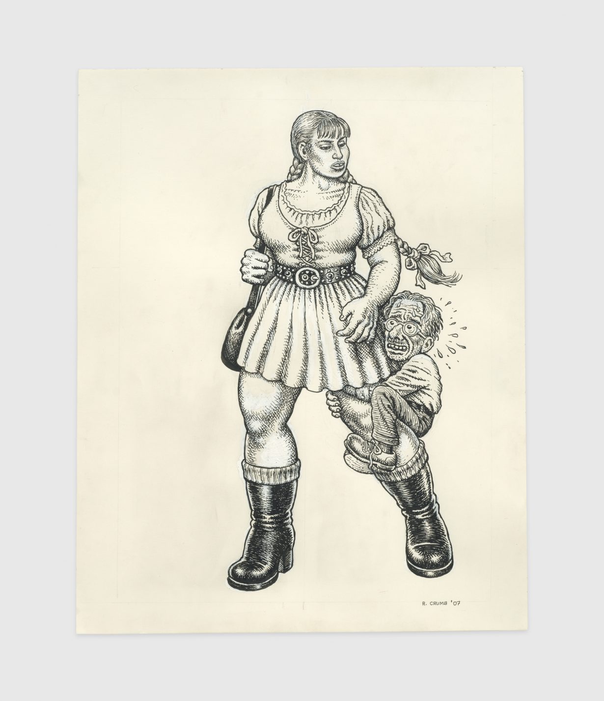 Evidently, Crumb’s politics stem from his deep-seated rejection of authority, whether it be at state-level or cultural – a remnant of a then-hopeful but now largely forgotten 60s counterculture. Crumb’s persistent, if reflexive, narcissism poses questions for younger generations: his images of women are oft uncomfortable, out of touch and irreverent – but misogyny isn’t the best label. It’s obvious he has a kink for built women – based on a childhood obsession with Sheena, Queen of the Jungle. But from a woman’s perspective, Crumb’s most endearing quality is the self-acknowledgement of his base perversion – a preferred outlook to a contemporary culture offering surgical services to standardise the female form. To put it lightly, he’s a proud simp for a highly specific musculature. Crumb’s unbridled id is the irreverent motor behind his work, sitting firmly between each densely hatched line. And that criticism is, evidently, another fire under his bony rump.