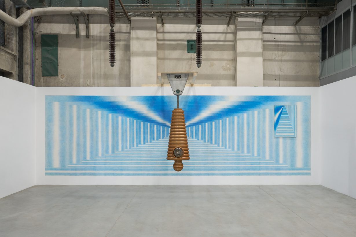 The Egg Egg brings together 50 works from the past decade on two floors of the vast building in nine ‘acts’. Its title plays on the rhyme between the artist’s surname and the Polish word jajko (egg), and egg shapes recur throughout, nodding towards an overarching, transtemporal complex of ideas: transformation, cyclicality and techno-futurist fantasies of cryogenic preservation and Singularity. The stage is set immediately by Sisyphus (2025), a monumental suspended ceramic bobbin, as used in textile factories like the one where Zajko’s grandparents worked and where he spent much of his childhood. Part worker’s body, part tool, this giant swinging bobbin-pendulum dictates time relentlessly, echoing the mythical figure of Sisyphus, condemned to endless labour.