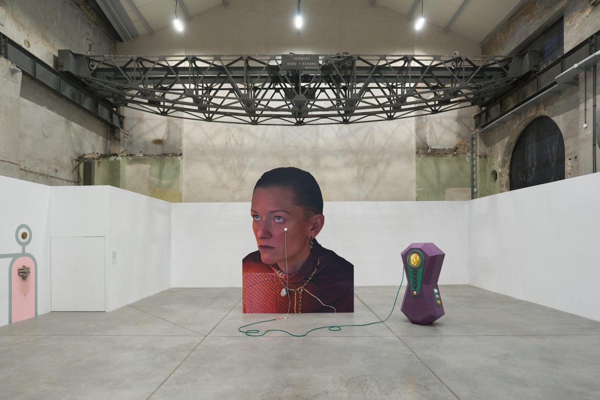 This is additionally illustrated by intricate drawings and etchings of internal machinic mechanisms, inspired by graphics found in an old television repair manual (once owned by the artist’s grandfather, rediscovered years later in a charity shop) that function as storyboards for the larger sculptural systems. The sense of entanglement, tinged with machinic eroticism, is also felt in the tubed wires that penetrate gallery walls and connect objects – messier interruptions keeping the exhibition from being overly pristine. In Matrix (2026), an image of the aforementioned Szczotka’s face midperformance is blown up to monumental scale, a plug protruding from just below her eye connecting it to another large capsule sculpture, Amber Chamber II (Resurgence) (2021). Elsewhere, systemic interdependencies are framed through the motif of wheat, rooted in the regional histories of agrarian industrialisation. His Progress Fatigue I, II and III (all 2023), small totemic sculptures of imagined wheat-deities, are positioned along the colourful wall-mural Bread and Milk (2026), which emplaces them in a broader codependent structure. Grain is positioned as an active participant in systems of cultivation and labour – domesticated and industrialised by humans, but still prescribing the seasonal rhythms organising life.