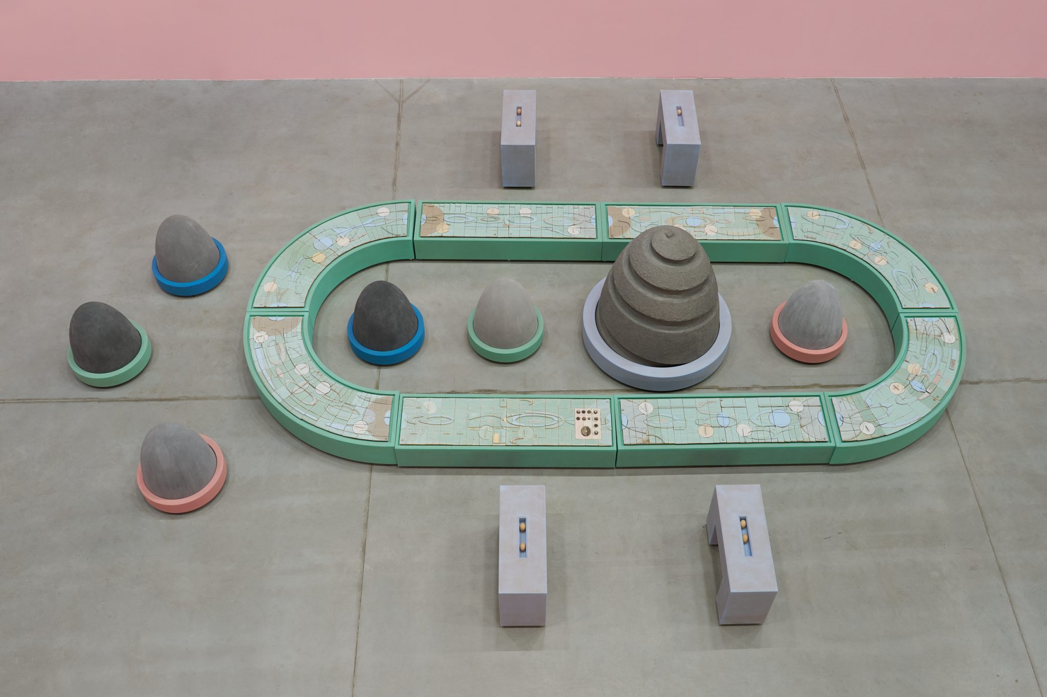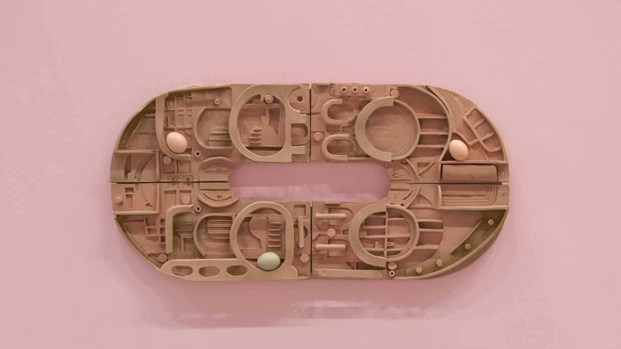 Born in Białystok in 1988, a year before Poland left the collapsing Soviet Union, Rafał Zajko spent his childhood amid the Eastern Bloc’s material and cultural afterlives. As one approaches the former power station that houses the Arsenal Gallery, communist housing blocks painted in faded oranges and pinks offer an origin story for his aesthetic language. The latter is shaped by brutalist architecture and industrial history but queered by a performative, camp sensibility and frequently offering the metaphoric possibility of remaking. In the main hall, for example, the modular installation Funny Games (2025) merges adult playground and brutalist public square. It’s composed of eight pastel-coloured platforms on wheels, their surfaces carved with glazed ceramic reliefs, that curve enclosingly around egg-shaped sculptural seats and a tall central totem. Zajko cites as an influence Frederick Kiesler’s Endless Theatre (c. 1924), a design for a reconfigurable immersive theatre without a fixed stage or seating; visitors and gallery staff can diversely rearrange Funny Games, including placing pickle jars from the nearby Larder I, II, III (2025) into its relief-compartments.