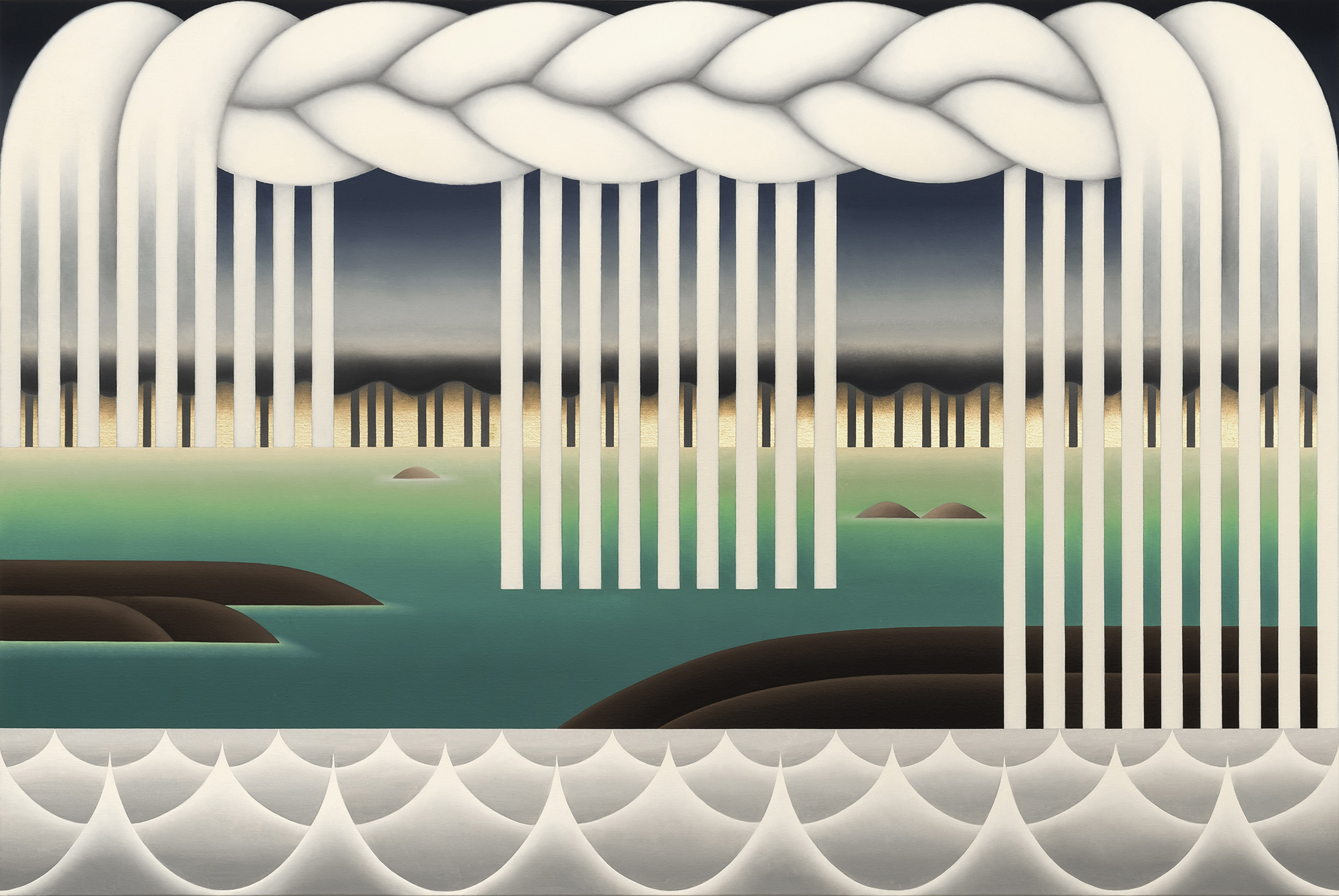 Included in Yamaguchi’s paintings are depictions of weavings, stitches and braided patterns – symbols of decorative crafts typically practised by women and historically dismissed in the artworld. These shapes appear alternately confining and liberatory; where the swirling decorations derived from Greek columns burst through Yamaguchi’s flattened planes, in Wrapper (2023) and Stitch (2023), interlocking white chains press down on horizon lines, their creamy ties stretched taut across each canvas. In Procession (2024), however, a knotted hair braid manages to break out of the canvas’s blue sky, its strands descending into straight white channels like rainfall. The storm evokes both the severe shapes of Minimalist sculptors like Dan Flavin or Donald Judd and the loose threads of an unfinished scarf or sweater.