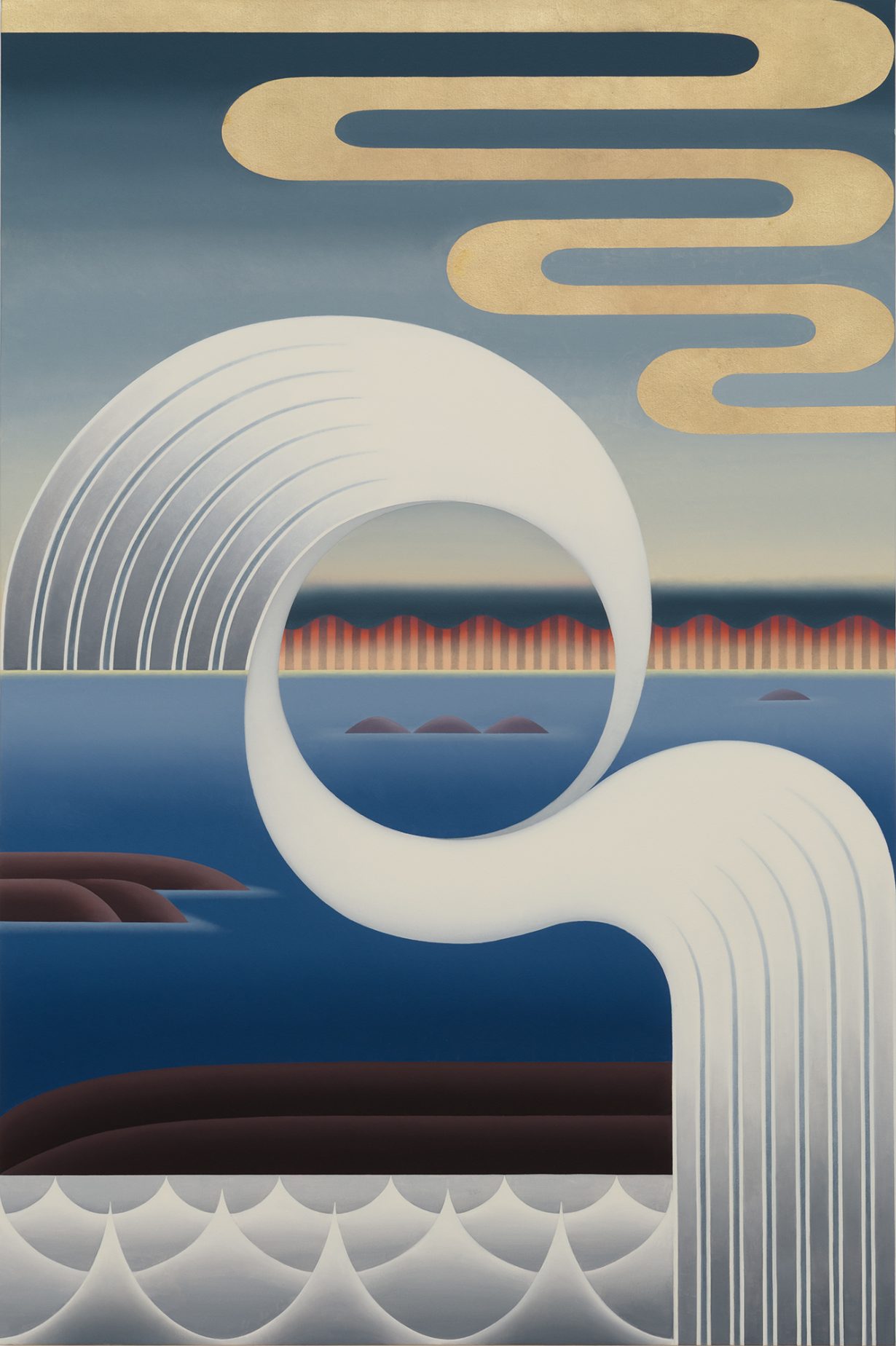 Residue (2023) depicts what appears, at first glance, to be a view of the ocean, but closer inspection reveals stencilled vertical bars and blue-white colour gradients in the sky and on the horizon, recalling the geometric abstraction of Frank Stella or Ellsworth Kelly. When Yamaguchi began making art during the early 1970s, grids, lines and colour gradients were the beginning and end of modern art; here, they’re just a part of the scenery. In Accomplice (2025), Yamaguchi reaches further into Western cultural memory: white shapes reminiscent of adornments on Greek ionic columns swirl above a rocky sea. But while many of her forebears eschewed figuration and decorative touches, Yamaguchi embraces their inevitability and slyly suggests how some of her peers’ now-outdated ideals foreclosed the more energetic expressions possible in her own artwork.