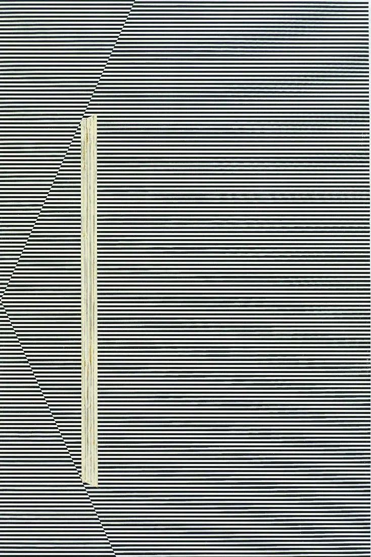 In the Whitney Biennial, 2010, Quaytman presents a suite of paintings that move along similarly self-divided lines. The twin centres of Distracting Distance, Chapter 16 (2010) are two images of the artist K8 Hardy, posing nude with a cigarette in the gallery in which the works are installed. The tableau repeats Edward Hopper’s A Woman in the Sun (1961): Hardy is framed by one of the Whitney’s signature trapezoidal windows; in one of the two works, the same low leather bench that sits in the centre of the gallery protrudes from the right edge of the image. Elsewhere in the room, panels screened with tight radial lines mimic the receding plane of the window glass.