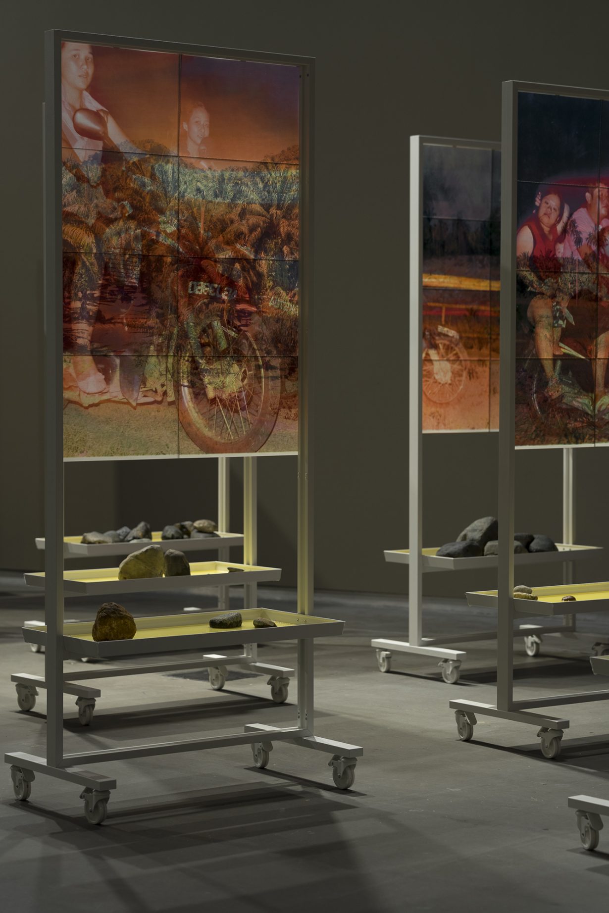 Most of the works in the show deal with the past and the legacy of the plantation; only a handful attempt to deal with the reality of plantations in the twenty-first century. Minstrel Kuik’s Residence Time (2025) is a photographic installation of double-sided, oil-stained photographs. One side is printed with candid photographs of the residents of palm oil estates in the artist’s hometown of Pantai Remis, Malaysia, zipping across dirt roads on motorbikes. The other side is printed with photographs of tropical evening skies, superimposed with the red streaks from motorcycle taillights: the palm oil that the photos are soaked in has made the paper translucent, allowing the images on both sides to bleed into one. Residence Time poignantly captures daily life in the plantation’s monotonous landscape, without the drama of other works in the show; filtered through Kuik’s lens and the glaze of palm oil, the photographs lend plantation life a cinematic touch of romance and tragedy.