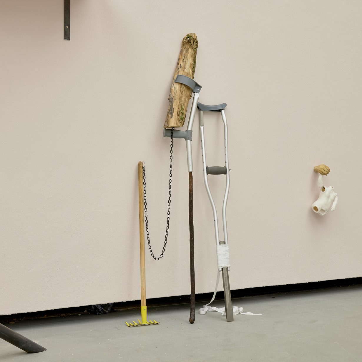 Jesse Darling, Grandad I (Ploughman John), 2023, wood, rake, crutch, chain, 145 × 24 × 33 cm. Photo: Tom Carter. Courtesy the artist; Chapter NY, New York; Arcadia Missa, London; Galerie Molitor, Berlin; and Galerie Sultana, Paris