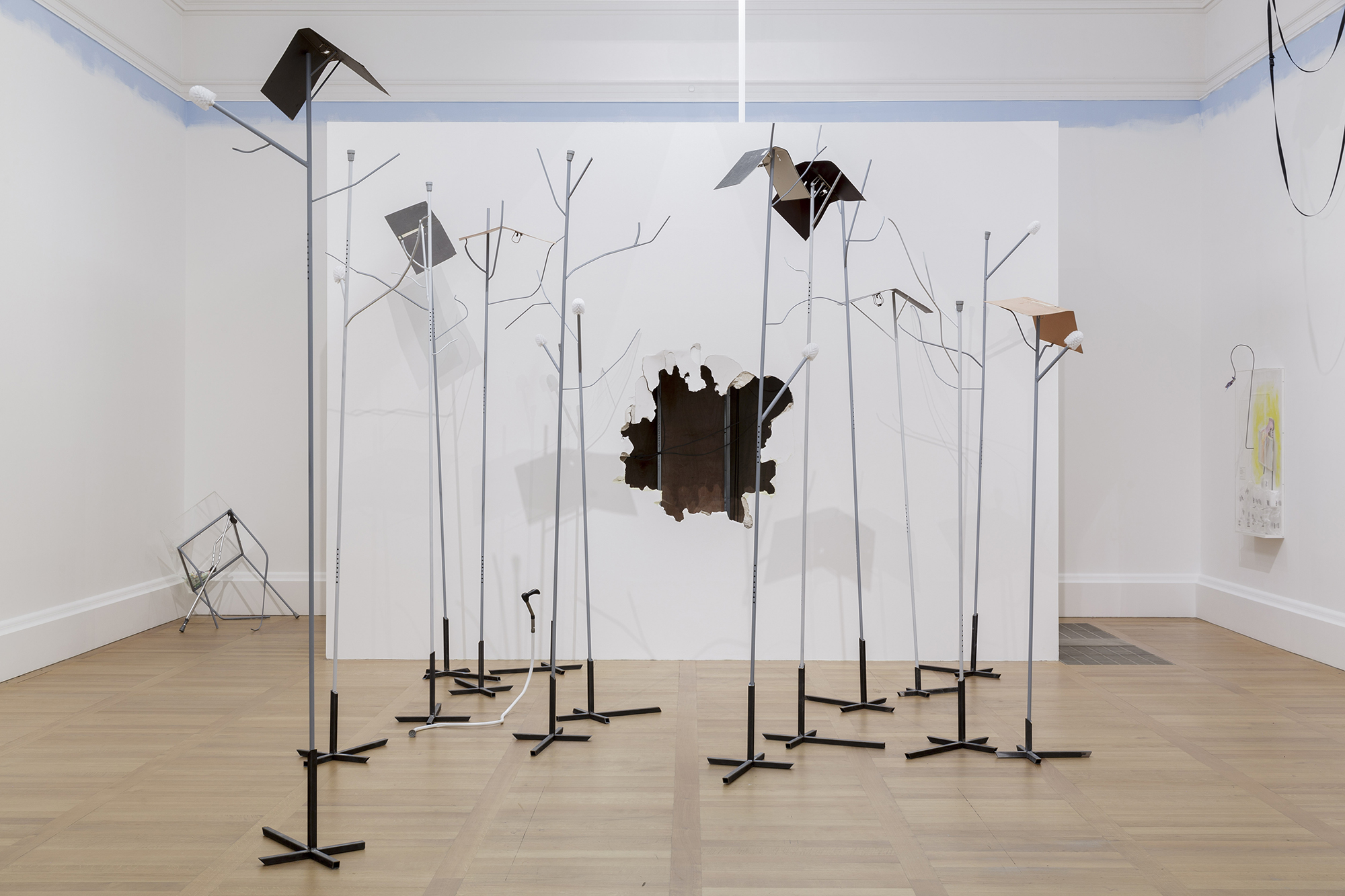 Jesse Darling, Saint Jerome in the wilderness, 2018, steel, lacquer, toilet brush, rubber ferrules, archival binders, dimensions variable. Photo: Tom Carter. Courtesy the artist, Chapter NY, New York; Arcadia Missa, London; Galerie Molitor, Berlin; and Galerie Sultana, Paris