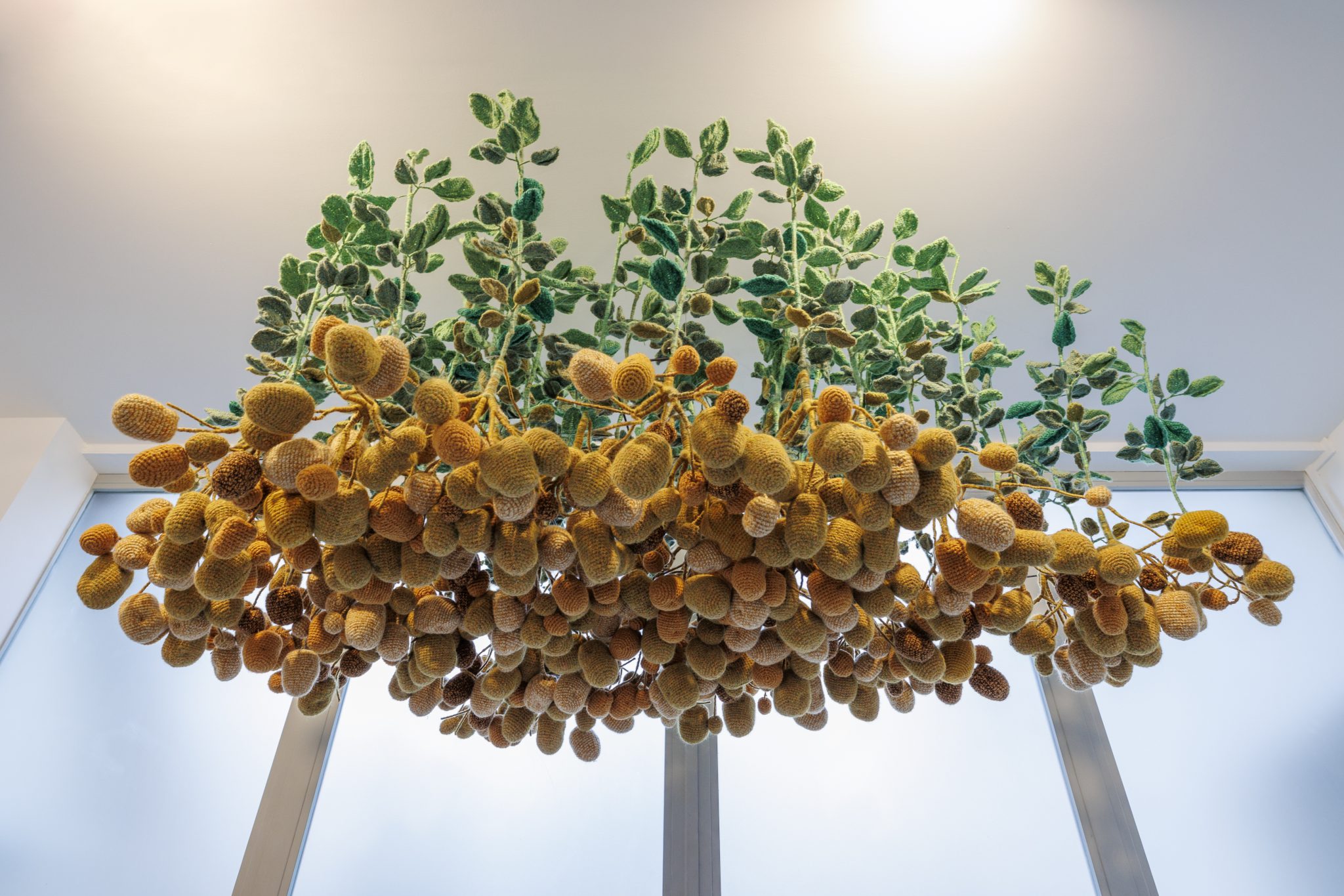 One reading of ‘sisters doing it for themselves’ is that it turned the old order upside-down. The curators make a literal point of this with Hu Yinping’s Potatoes Grow on Trees (2025), woollen potato plants hung from the ceiling, nourished by air not soil. Crocheted by a collective of older women Hu set up in her hometown of Luzhou in Sichuan Province, the potatoes have the cooperative roots of the Self-Comb societies.