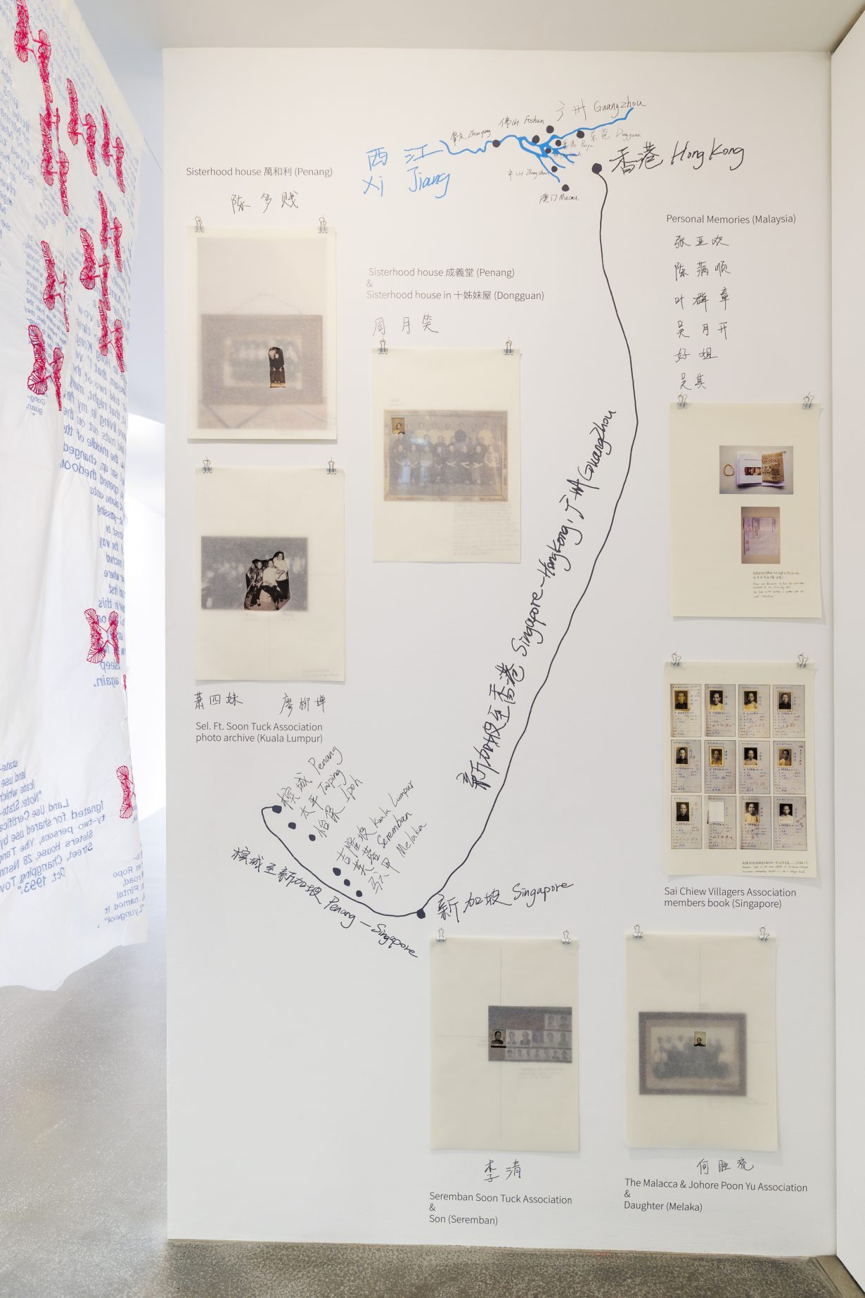 Featuring mostly Asian artists, Threads of Kinship weaves a tangled web of colonial commerce, migration, utopianism and female resistance. These grand themes unspool across the region like long geo-economic strands from a conceptual chrysalis: a sisterhood that emerged from the nineteenth-century silk industry in the Pearl River Delta in southern China. The exhibit’s curatorial thesis centres on sericulturists and weavers who were among the first women in China to work together in large numbers and earn a good wage. Camaraderie and financial independence were their tickets out of marriage. The women organised themselves into female phalansteries. They took vows of celibacy, calling themselves Self-Comb Sisters because initiates had their hair put up by fellow members, pointedly deviating from the tradition of mothers and sisters pinning up the bride’s hair in preparation for conjugal life. During the 1930s the silk business collapsed, and many of these gupo, meaning ‘older unmarried aunt’, moved to British colonial Singapore, Malaysia and Hong Kong as domestic workers. There they set up sisterhood houses and sent money back to their families every week.