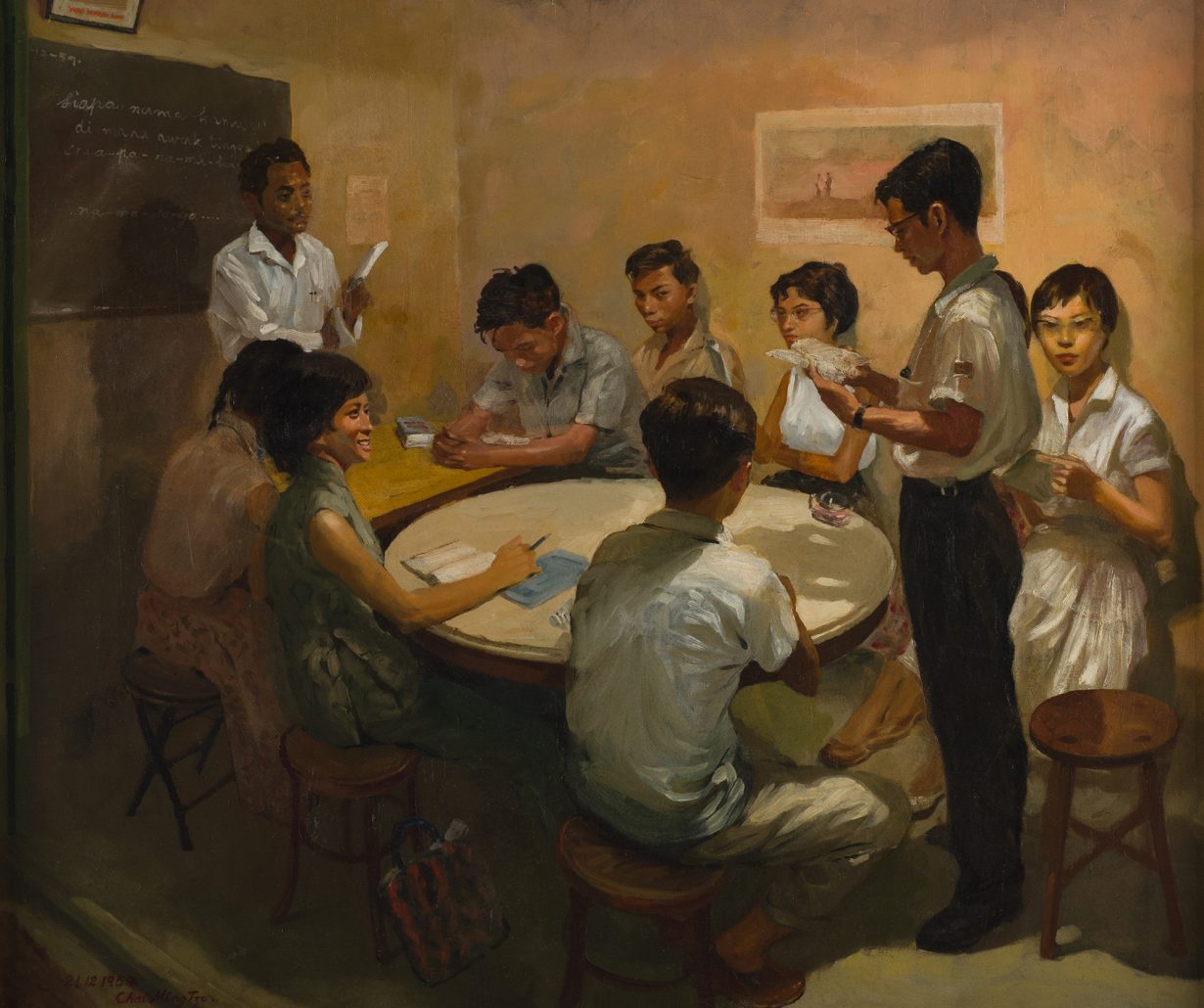 In this regard, a work in the NGS show, Chua Mia Tee’s iconic painting National Language Class (1959), provides a fruitful way to think about national identity. The work is as slippery, fresh and relevant today as during the tumultuous time of its creation, when Singapore was granted full self-government from the British. National Language Class is set in a classroom, where a group of Chinese students are gathered to learn Malay, the newly designated national language for a multiracial country. The reception is mixed. Amid eager faces is a man staring straight at the audience (often identified as the artist) with a fierce, wary gaze. On the blackboard are questions in Malay: ‘Siapa nama kamu?’ (what is your name?) and ‘Di mana awak tinggal?’ (where do you live?). The painting suggests that forging a national identity is by no means ‘natural’, but is instead instructed and constructed; it involves effort and discomfort, akin to the process of learning a different tongue. And in creating narratives about nation-building, perhaps we can all take a leaf from that young man holding our gaze, which is to engage with such projects with a healthy dose of scepticism. The fundamental lesson from National Language Class, at least to me, is to view national consciousness as a participatory and pragmatic process of consensus-building, with a dynamic, animating layer of contention and difference – the concept implies unity and disunity.