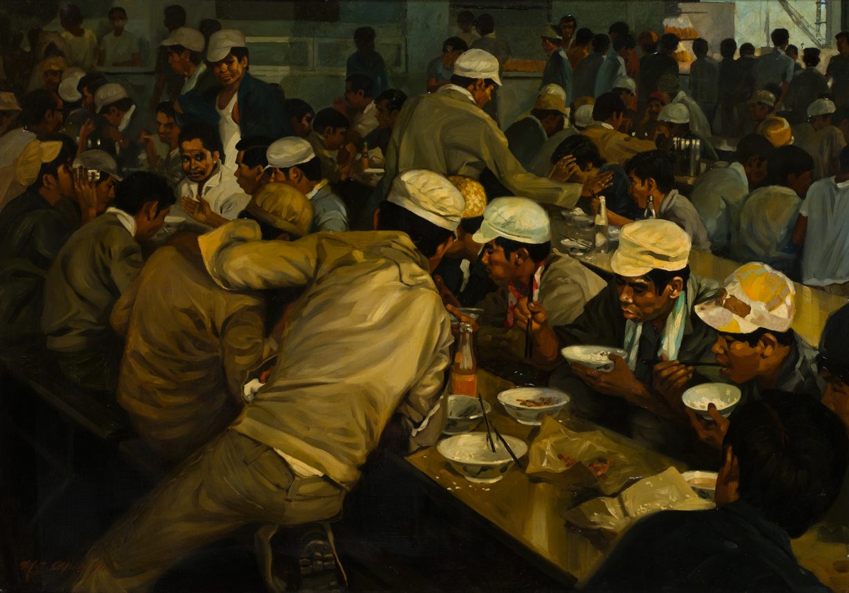 The ‘Imagining Nation’ section of the 1950s and 60s is particularly strong. Here history and art history interpenetrate climactically: anticolonial sentiment, nationalist aspirations and socialist concerns are matched by the creative grappling of artists trying to find a language authentic to their experiences and dreams. Significantly, the section reflects on class and class struggle – a divisive topic often elided in conversations about national identity and a significant challenge to Singapore’s sense of unity. In this section are representations of the workers who helped build modern Singapore. Among these are Lim Hak Tai’s Indian Workers Clearing the Jungle (1955), depicting sarong-clad, barebodied labourers hacking down palms painted in bold slashes of colour and Chua Mia Tee’s Workers in a Canteen (1974), a busy tableau of uniformed workers eating and chatting at the tuckshop at Jurong Shipyard. In Lim’s Riot (1955), he uses abstracted shapes and bold colours to depict a generalised scene of violent clashes between people, inspired partly by the Hock Lee Bus Riots (1955), a strike by unionised bus workers that turned into a riot that killed four people and injured 31.