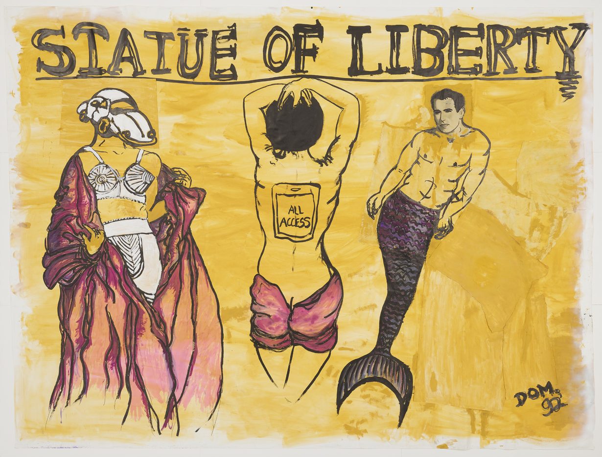 Singaporean artist Dominique Hui’s largescale mural Statue of Liberty (1992), featuring three figures of indeterminate gender, captures playful attitudes towards sex, materialism and American culture. The figure on the left is dressed in a Madonna-inspired conical bra and has a white car for a head; in the middle is a person, viewed from behind, shorts pulled halfway down their buttocks, bare back emblazoned with the words ‘ALL ACCESS’; on the right is a sinuously curved merman with the face of Jeff Koons, or more specifically, Koons’s self-depictions in his explicit Made in Heaven series from the 1980s and 90s, which comprised sculptures and paintings of him performing various sex acts with his partner, a Hungarian-Italian pornstar.