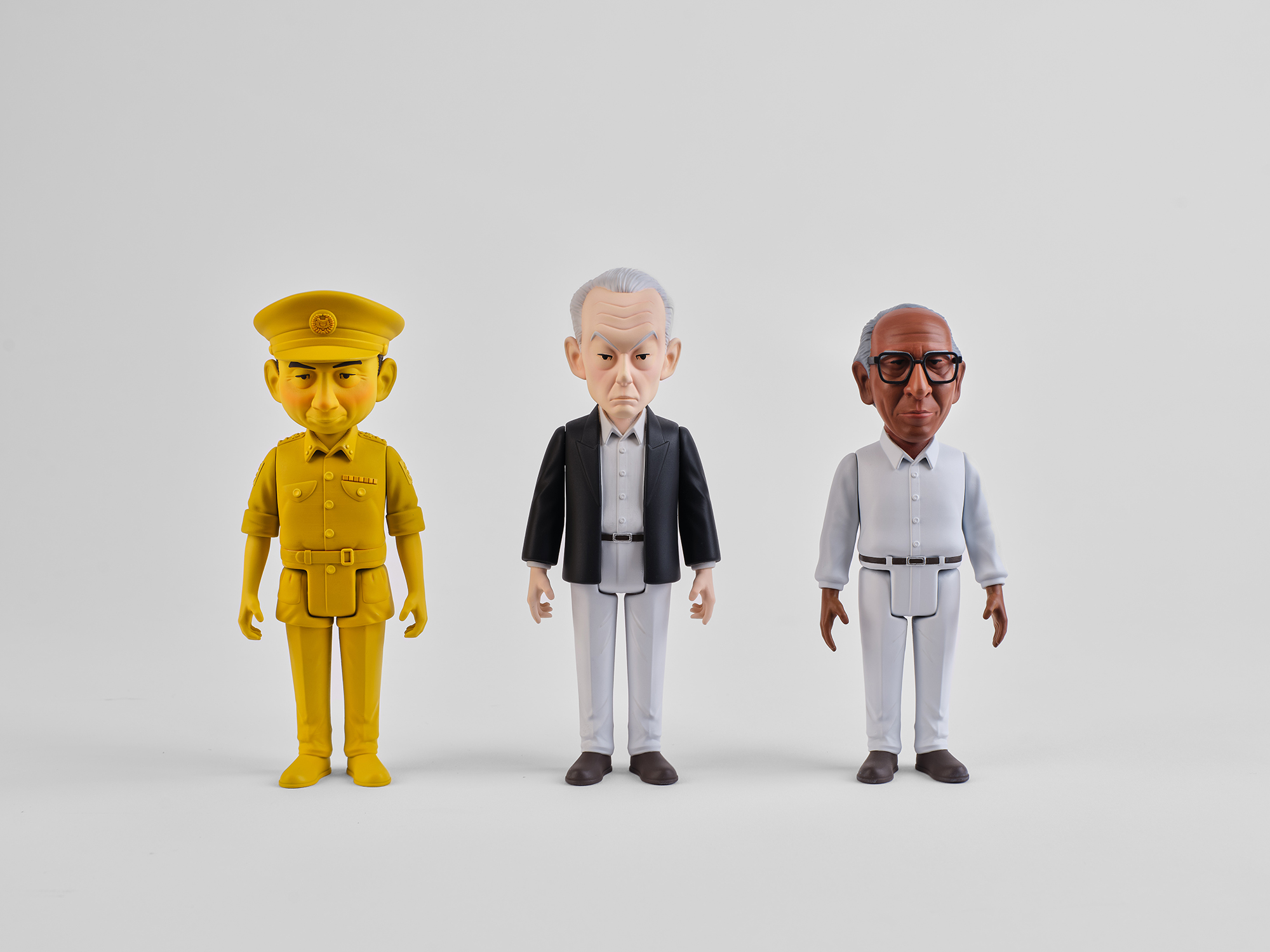 While Josef Ng was missing from NGS, he is prominently featured in Sonny Liew’s reference-packed P.A.P. x P.A. (2025), which comprises specially made action figures of Lee Kuan Yew, Goh Keng Swee and S. Rajaratnam, as well as numerous references to key performance-art events. Each doll is packed with different accessories, such as a pair of scissors, a cigarette, a cane, tofu and red dye, all of which are props from Ng’s performance. There are other in-jokes for viewers privy to Singapore history, such as the words printed on the jacket of the Lee Kuan Yew doll, ‘a luxury we can now afford’, a reference to his infamous but unverified quote ‘poetry is a luxury we can’t afford’ – illustrating how pragmatic and censorious the pap old guard was with regard to culture.