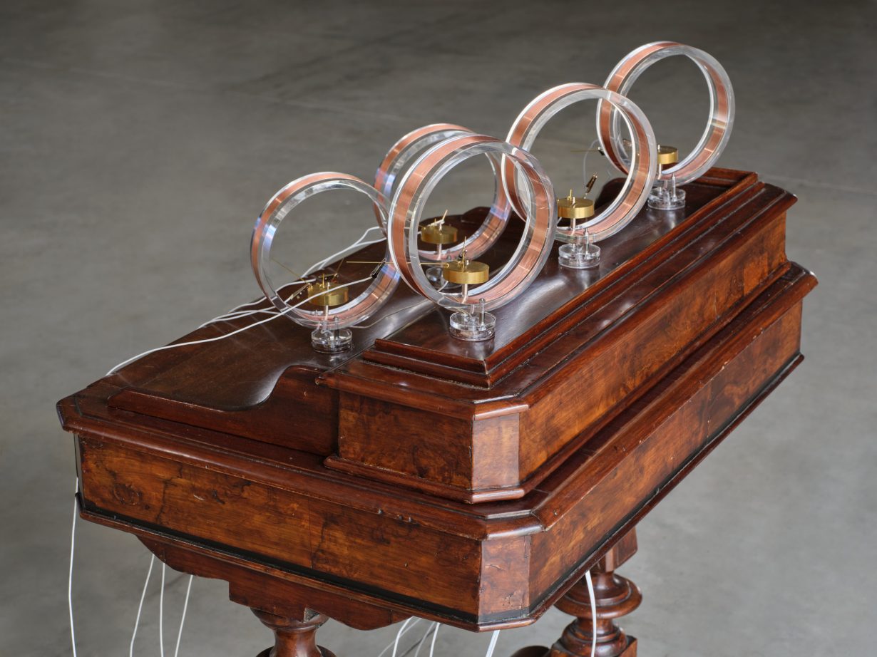 Yet, while each work (there is a work from the Decomposition series, 2021–, in which light and sound are triggered by rotting fruit, which formed the mainstay of Mohri’s presentation in the Japanese Pavilion at last year’s Venice Biennale) is full of its own systemic wonders and eccentric logical leaps, the exhibition is more remarkable for how the sculptures are collectively orchestrated to perform, with sound and movement coming through in waves of agitation and passivity, sometimes like the chatter of a crowd, at others like the whisper of a wind. In the end, the exhibition isn’t about a focus on individual works, rather on the constellation as a whole.